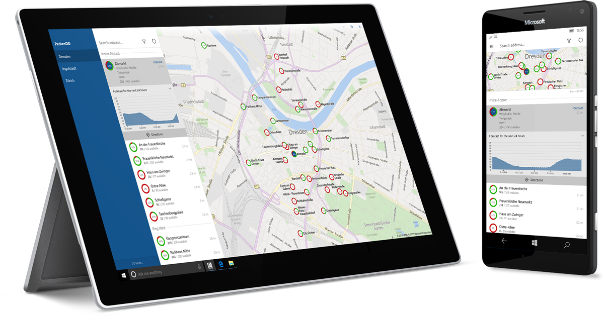- helpful Cortana integration (e.g. ask "ParkenDD, where can I park in Dresden?" or "ParkenDD, show me details for the Centrum Galerie in Dresden!")