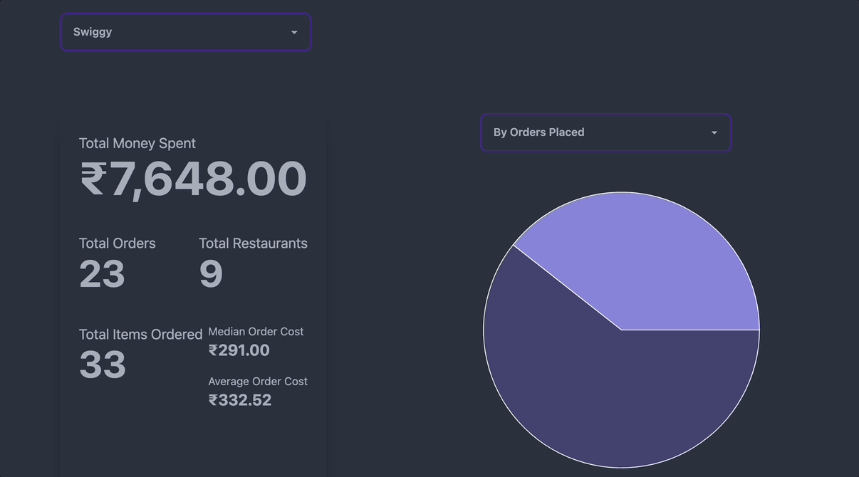 Ever wondered how much you've spent on ordering food online on apps like Zomato and Swiggy? Well, we did too. So we built Snackalytics, a chrome extension that analyses your Swiggy and Zomato order history, giving you valuable metrics and insights. It was built with TypeScript, React, TailwindCSS, DaisyUI, Recharts, and lots of love for food.