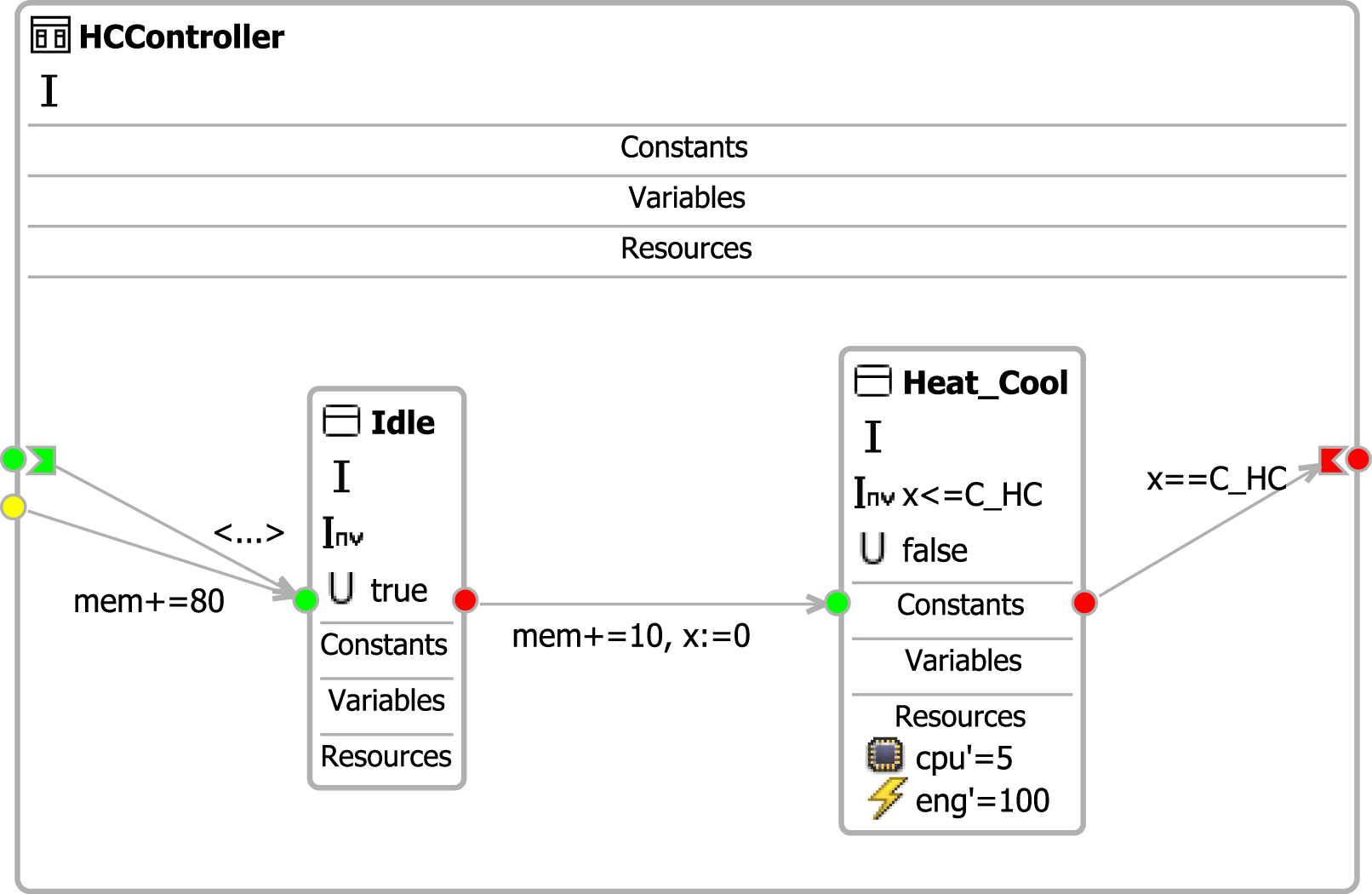 REMES (REsource Model for Embeded Systems) is a behavioral modeling language supporting component-based embedded systems. In REMES, the internal behavior of an embedded component is denoted by modes, atomic- or composite. The mode’s discrete control is ensured by a control interface (entry- and exit points), while the data is transferred between modes through a data interface. The control flow is depicted by a set of edges, annotated with discrete actions, whereas the resource-wise behavior of a component is expressed by mode annotations in form of the first derivatives of the resource variables, which evolve at positive integer rates. The analysis of REMES-based systems is based on a weighted sum in which the variables capture the accumulated consumption of resources.