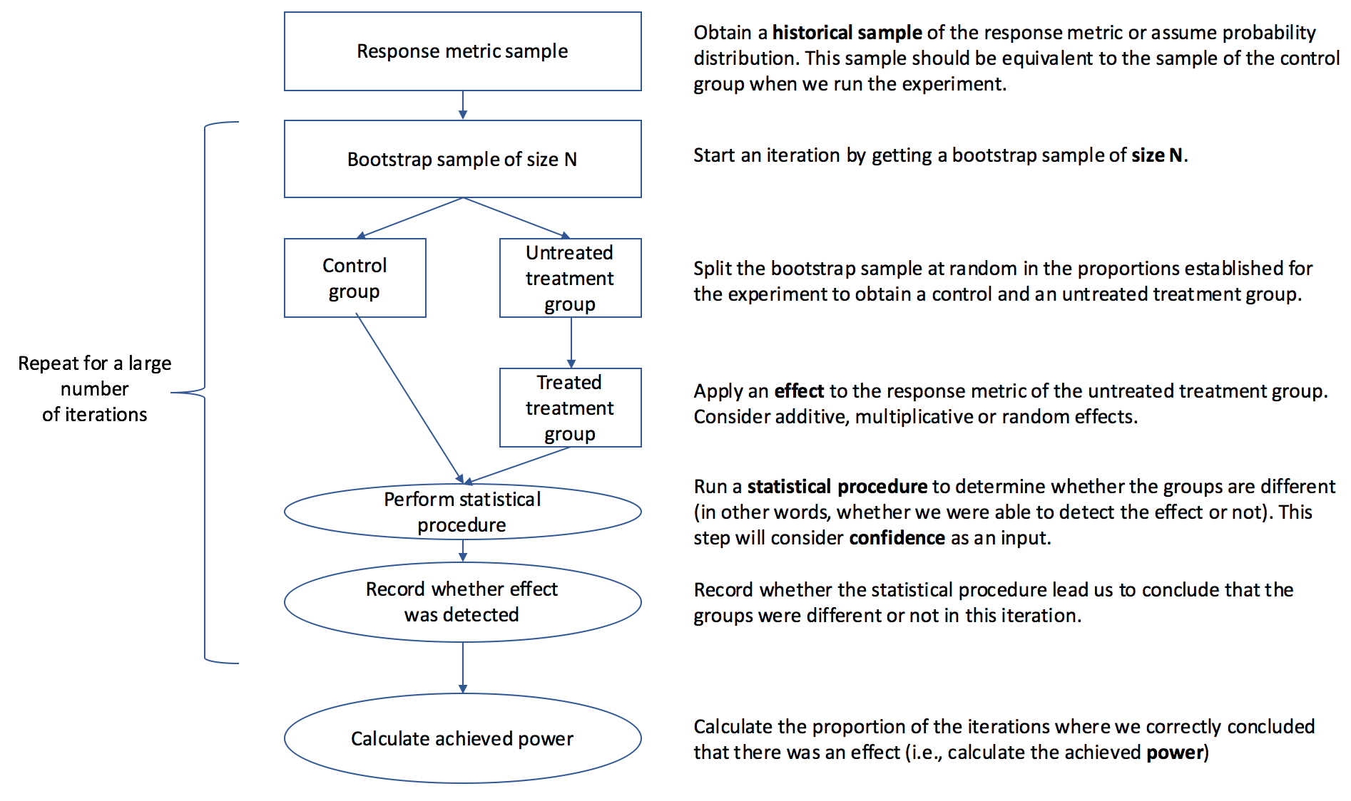 This simulator is useful in situations when parametric power estimation (for example using t-test) is not possible due to small sample size (when CLT is not applicable) or non-conventional metric, which can't be parametrized by a known probability distribution.