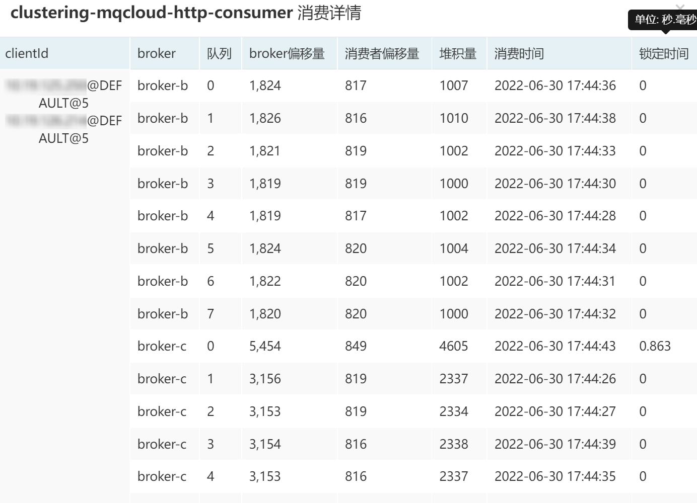 以上种种辅助功能均可通过修改redis中的队列偏移量实现或在MQ-Proxy中实现,MQCloud中已经支持这些功能了,例如下图为某个HTTP协议的集群消费者的消费进度,消费时间,以及堆积情况: