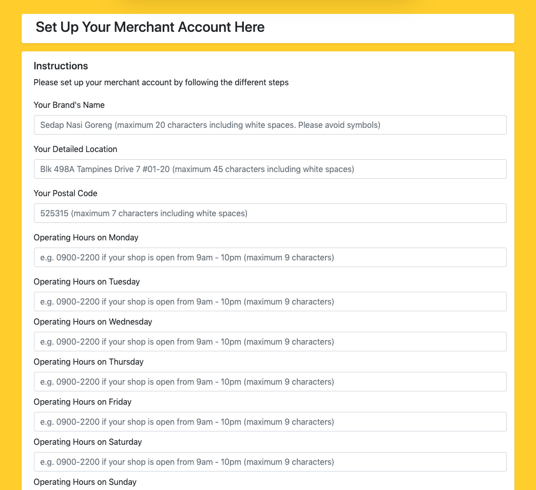 Set up your merchant account with your brand's name, detailed location, postal code and operating hours. Now it even includes a cut off timing!
