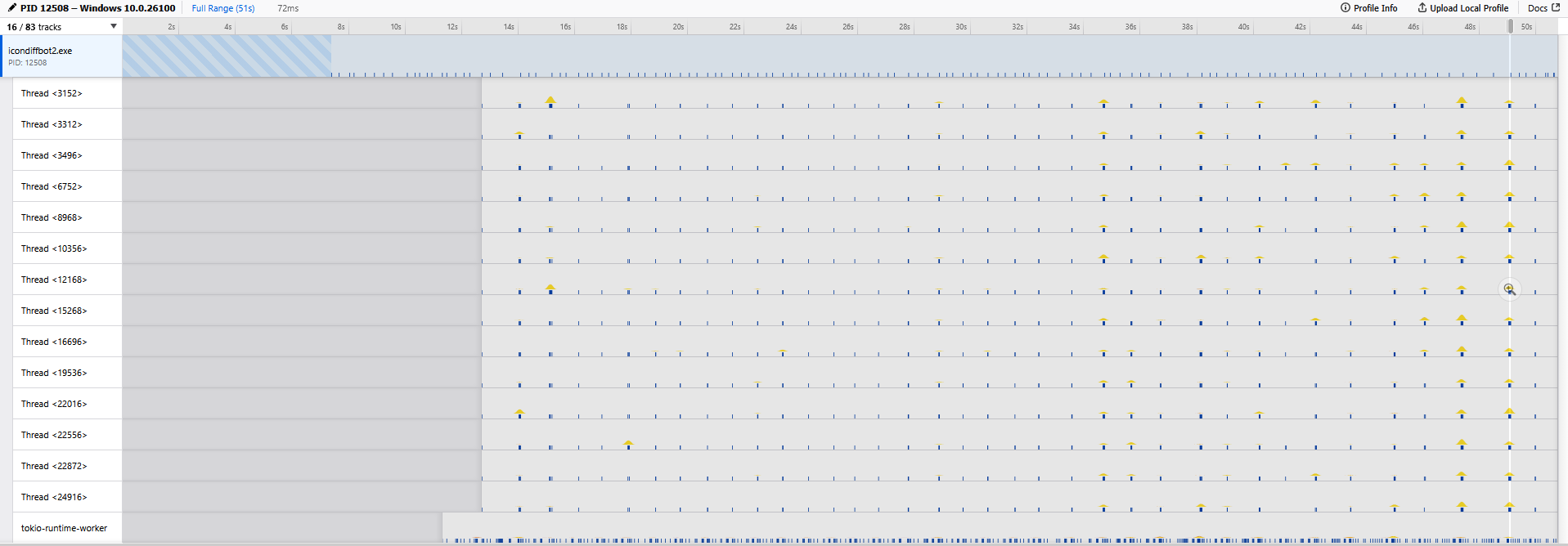 Main difference is that the tokio-runtime-worker thread is no longer pegged at 99% CPU the entire time.