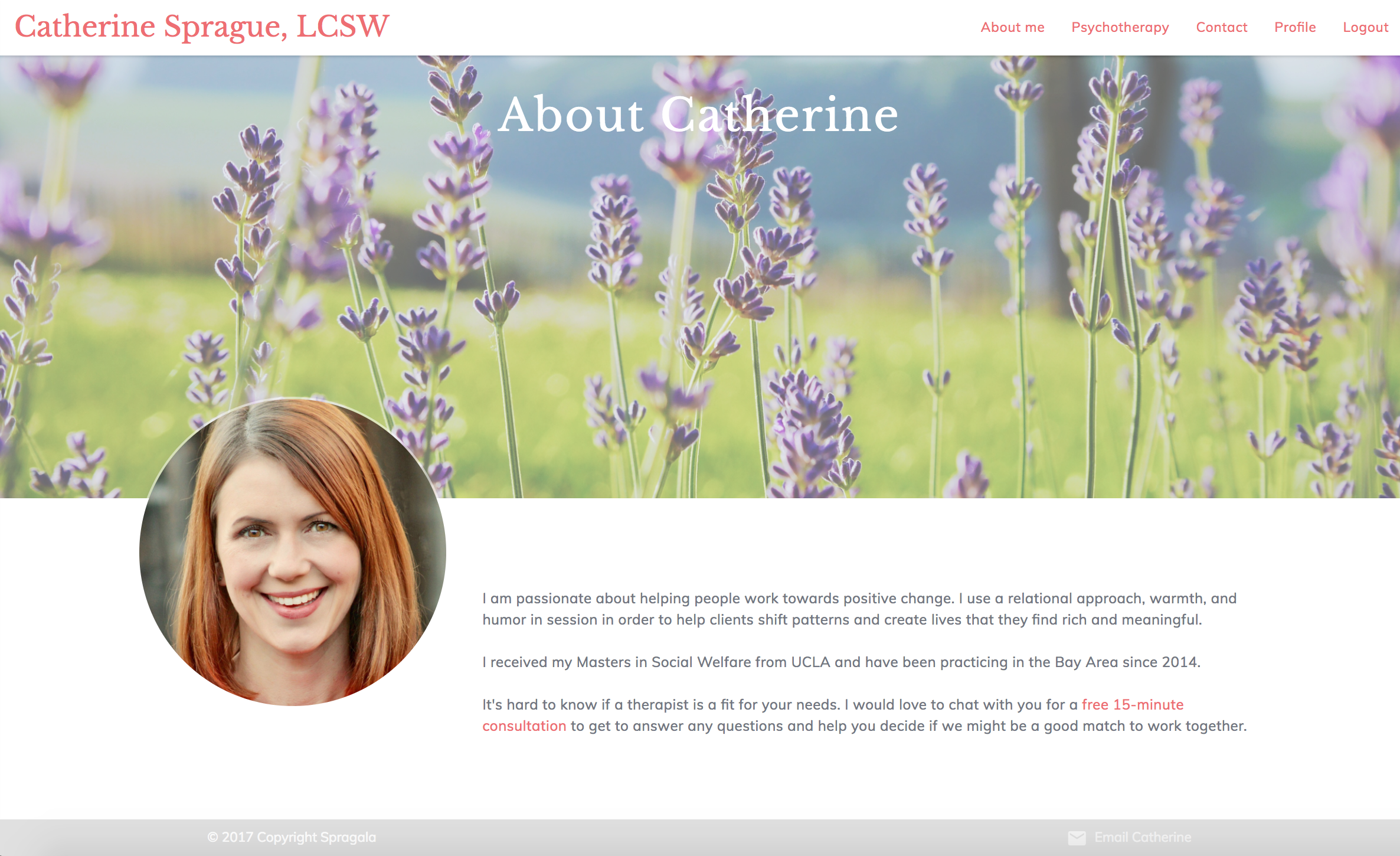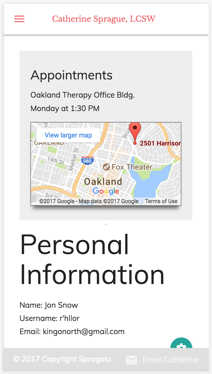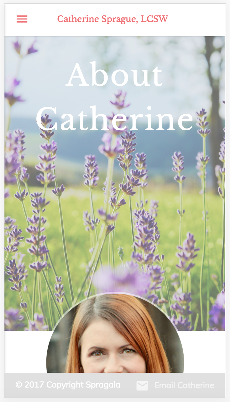 Catherine Sprague is a therapist working in the Bay Area. She is building her client base, so I built a site that would act as a marketing tool for her business; as a platform for communication with both prospective and established clients; and as a way to track appointments for both Catherine and her clients.