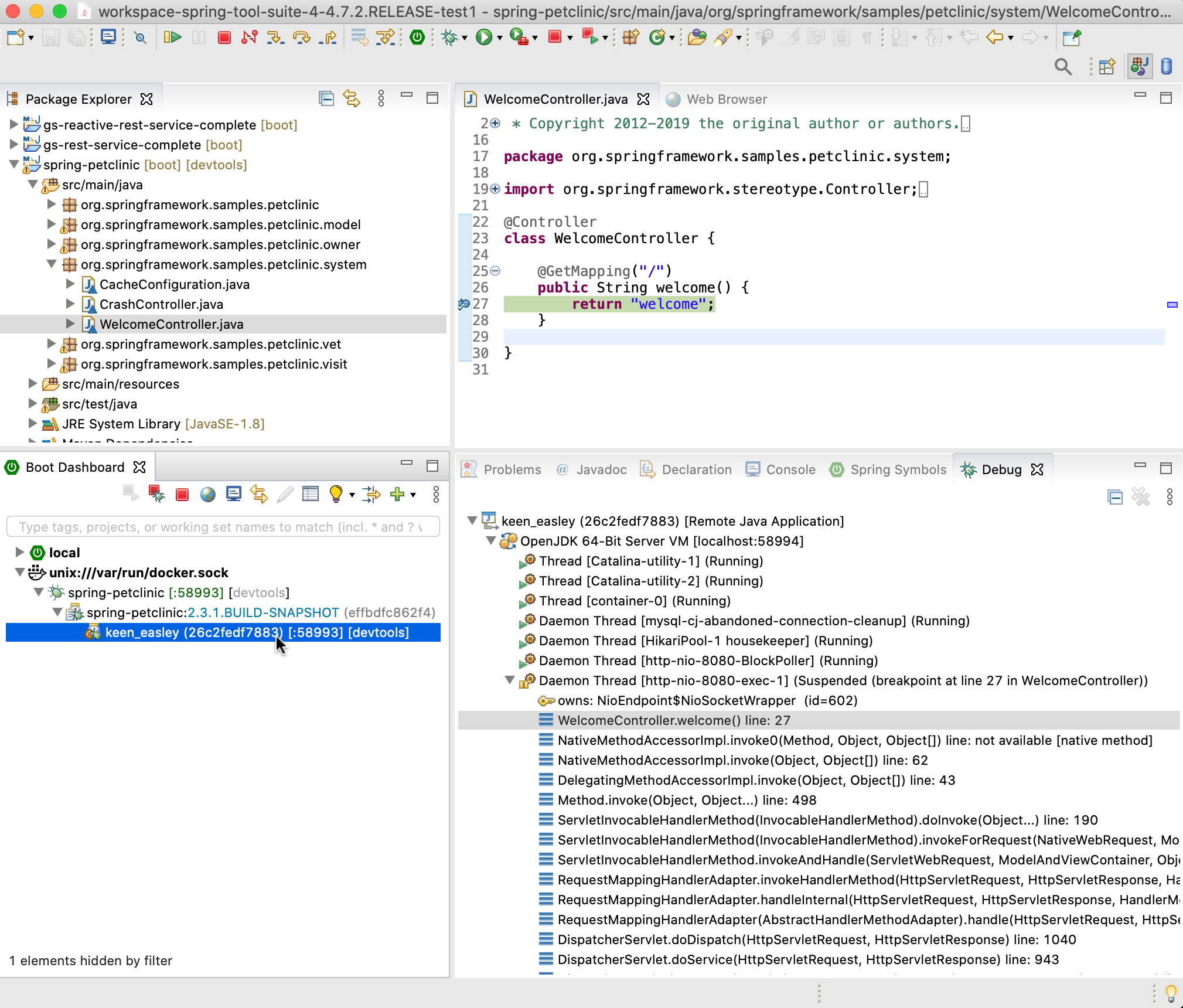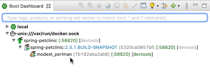 Instead of just building the image and running the app in a container on docker, the boot dashboard also allows you to run the application inside of the container in debug mode and automatically connects the Eclipse debug UI to that process. That way, debugging the app when running inside of a container becomes pretty much the same easy experience than running the project locally in debug mode.