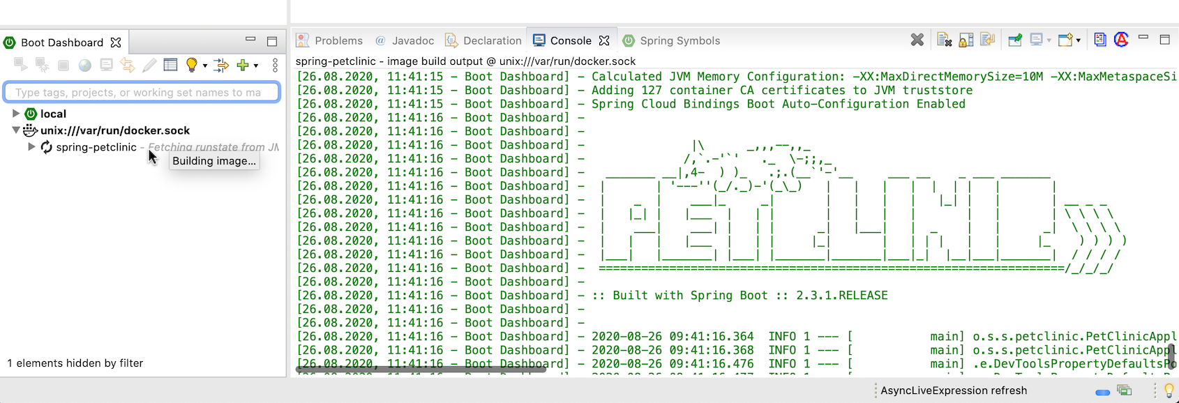 Once created (assuming you have Docker running on your machine), you can easily drag&drop your workspace projects onto that docker target. In case the projects use Spring Boot 2.3 (or higher), this drag&drop operation initiates a build of the project with the goal to create a container image using the Spring Boot support for creating OCI container images. The output of that build appears in a console, so that you can see exactly what is going on as part of the build.