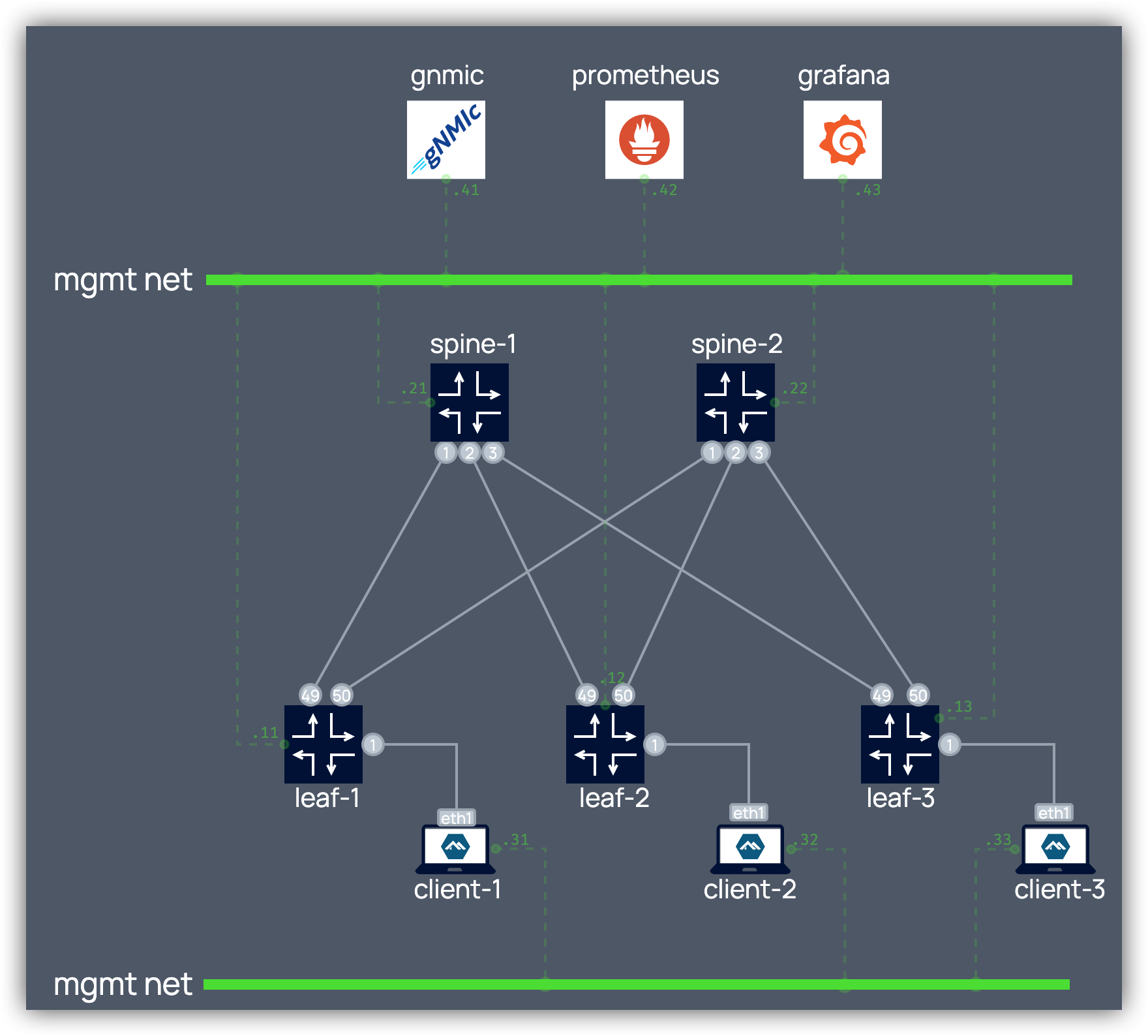 This lab represents a small Clos fabric with Nokia SR Linux switches running as containers. The lab topology consists of a Clos topology, plus a Streaming Telemetry stack comprised of gnmic, prometheus and grafana applications.