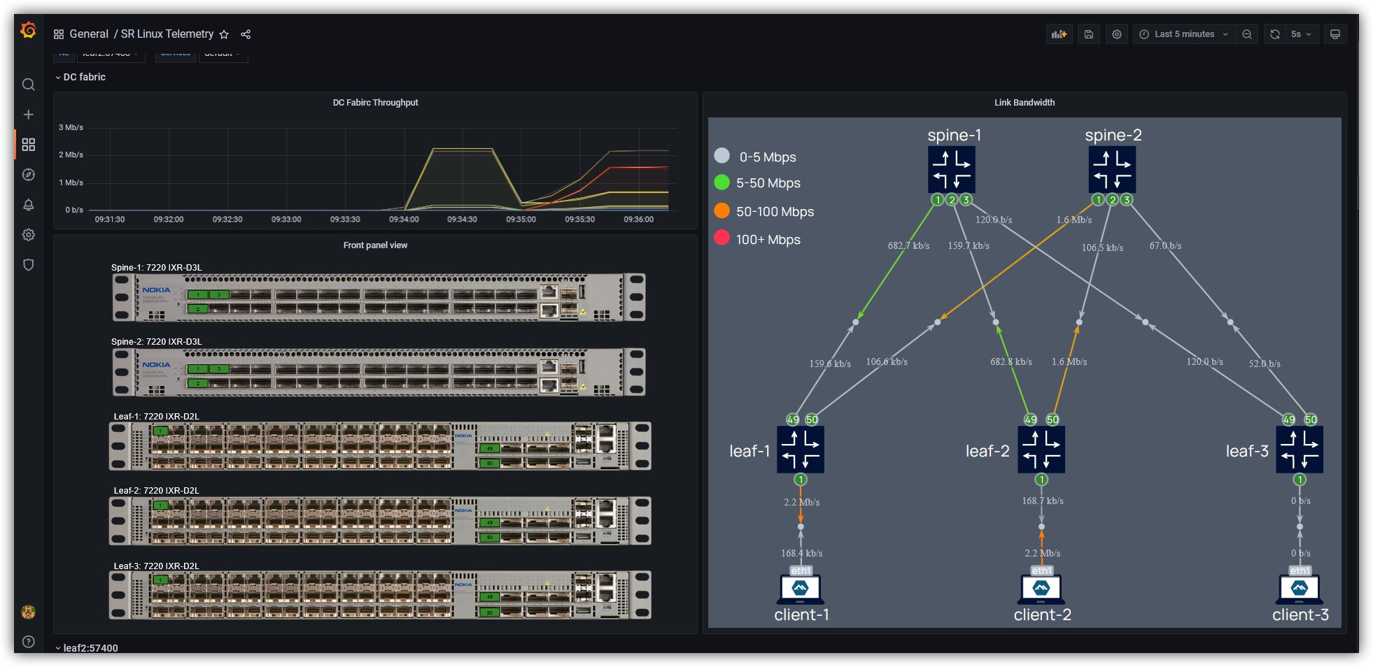 Grafana dashboard provided by this repository provides multiple views on the collected real-time data. Powered by flow plugin it overlays telemetry sourced data over graphics such as topology and front panel views: