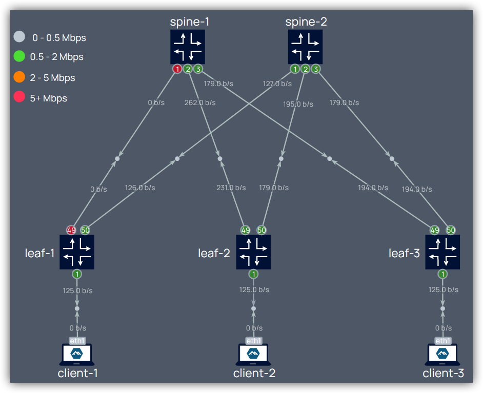 When the lab is started, there is not traffic running between the nodes as the clients are sending any data. To run traffic between the nodes, leverage traffic.sh