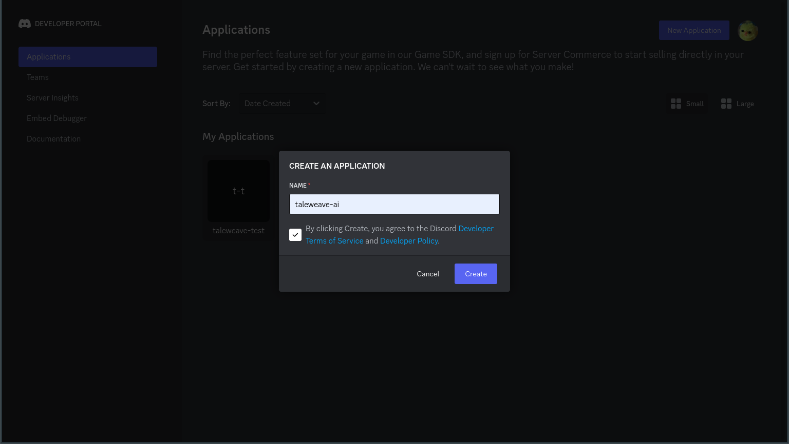 Visit the Discord Developer Portal and create a New Application: