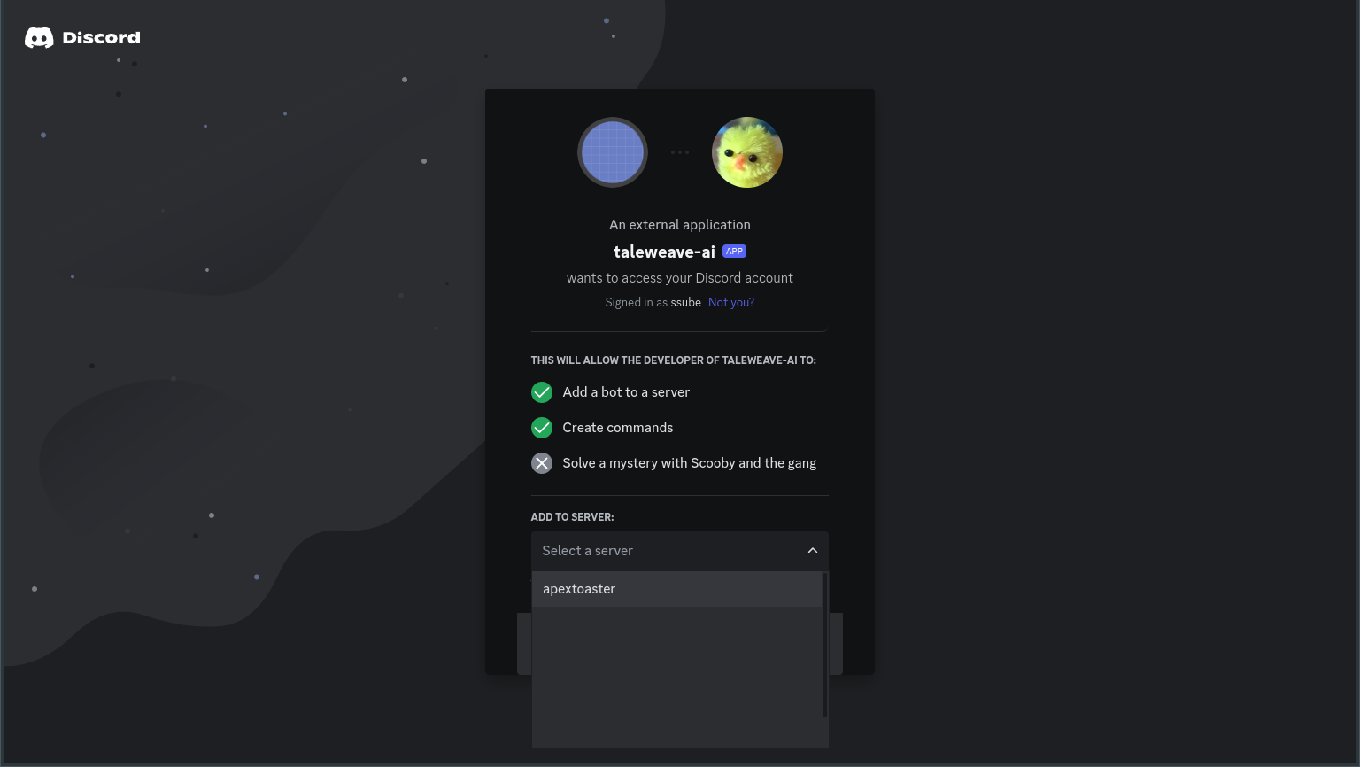 Select the server where you want to play TaleWeave and click Continue. Make sure the permissions shown match the