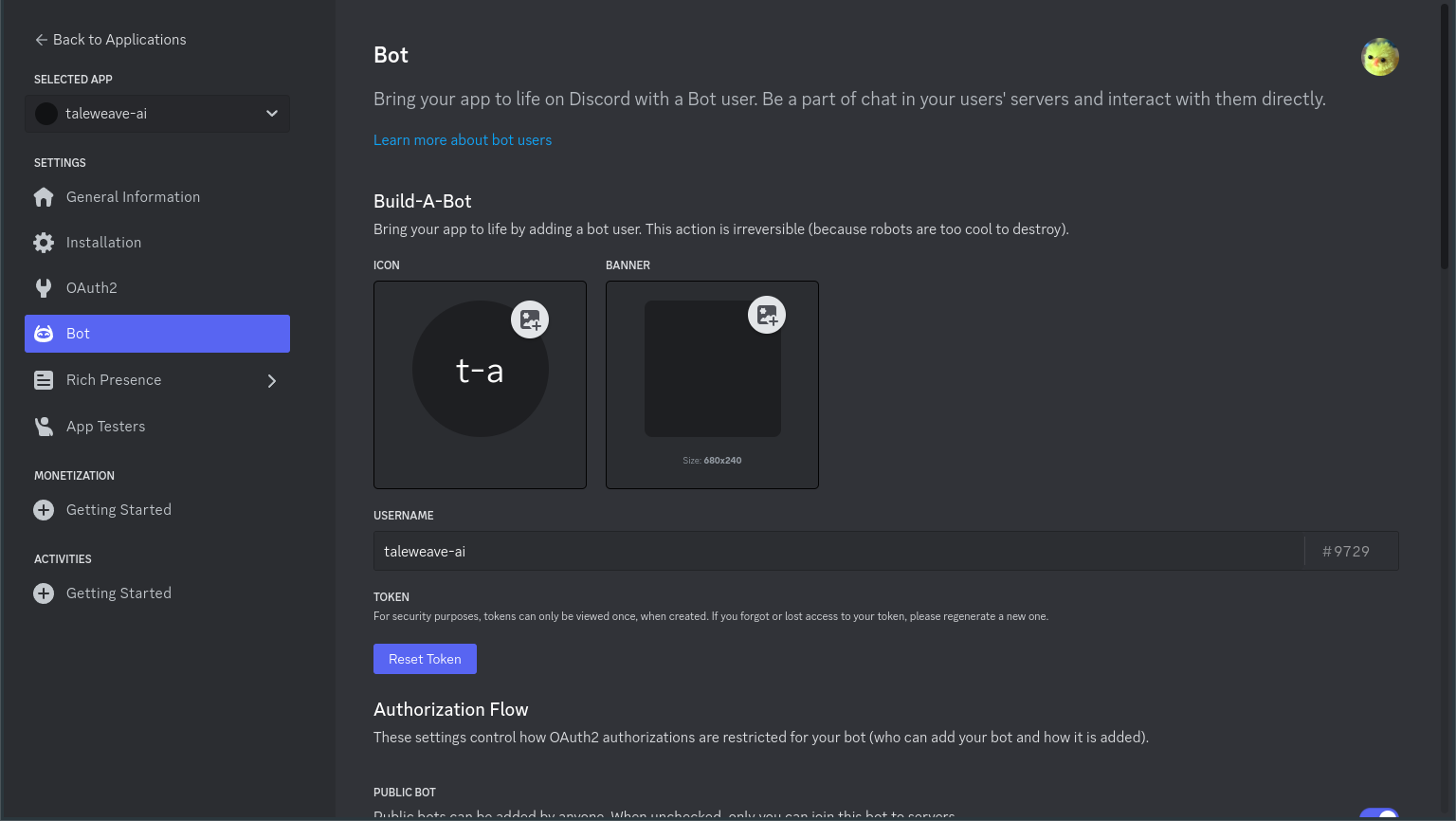 On the Bot tab, configure the username, icon, and make sure the Public Bot option is checked: