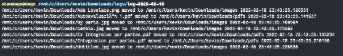 Logs are useful to know which files were moved and where, this log saves the original file's path and destiny path join with the date and hour of the operation. All logs of the day are saved at a same file. This file also have the date when was created.