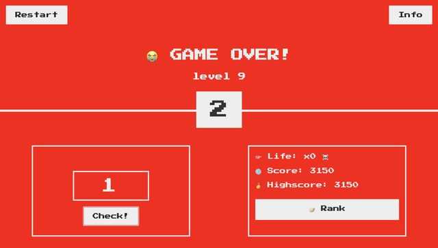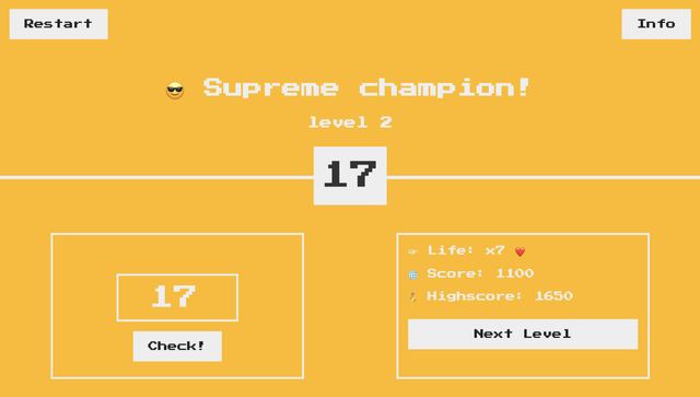 The game has a levels logic, each game starts with five lives and you have to guess the number (random between 1-20) within the lives you have. Each game starts with five lives and you have to guess the number within the lives you have. For each 5 level you can play a bonus level which consists in guessing a number among the three suggested.