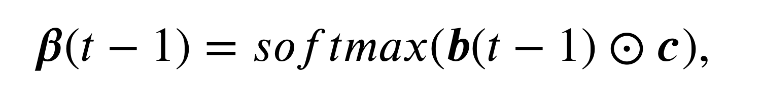 \symbf{\beta}{(t-1)}=softmax(\symbf{b}{(t-1)} \odot \symbf{c}),