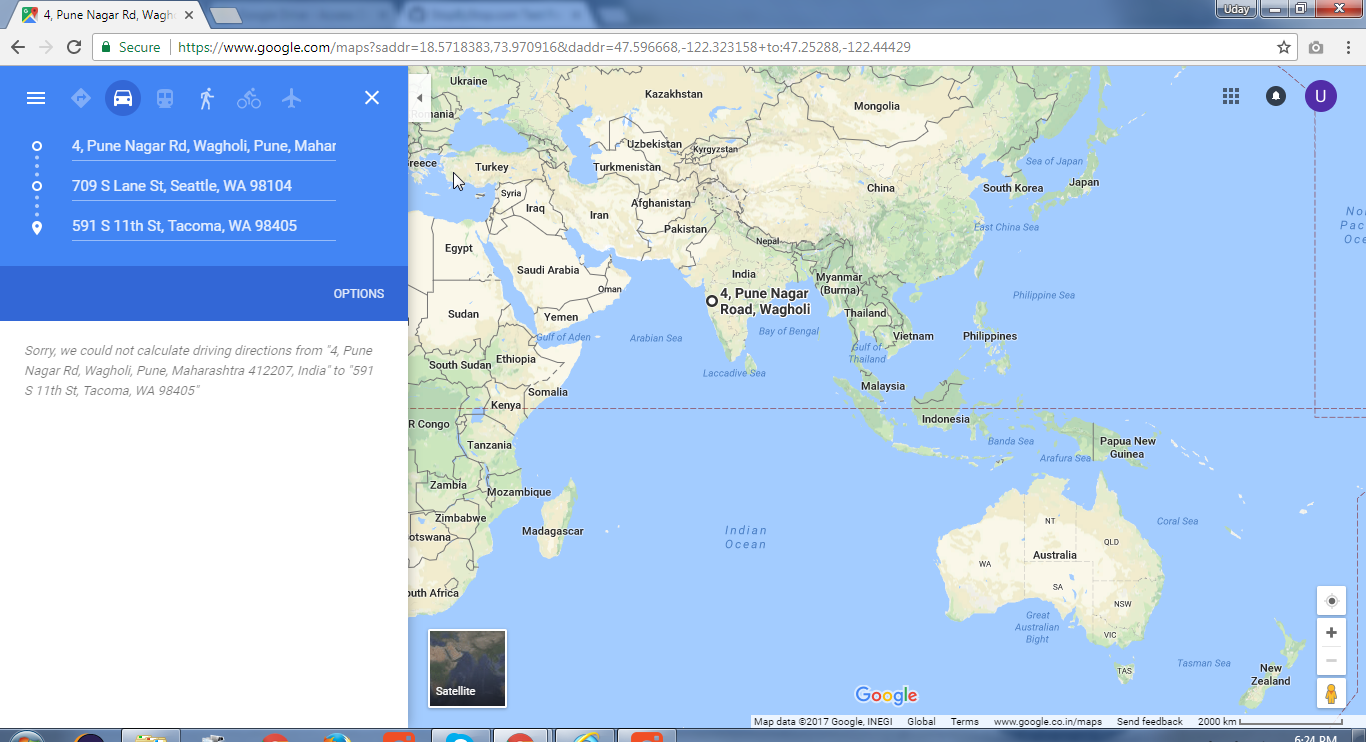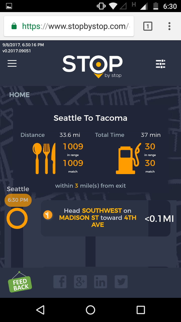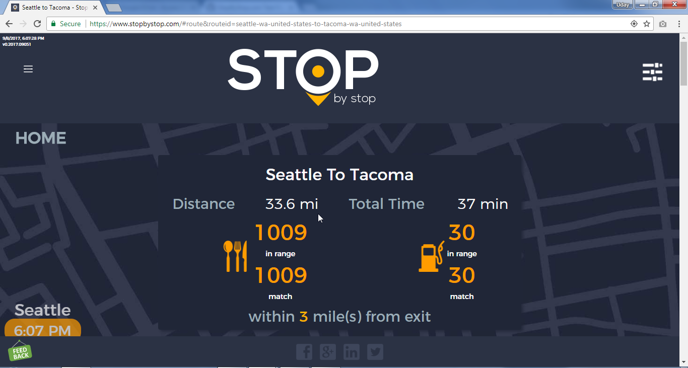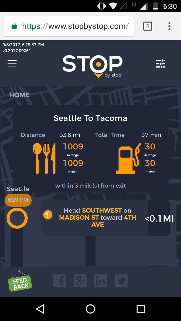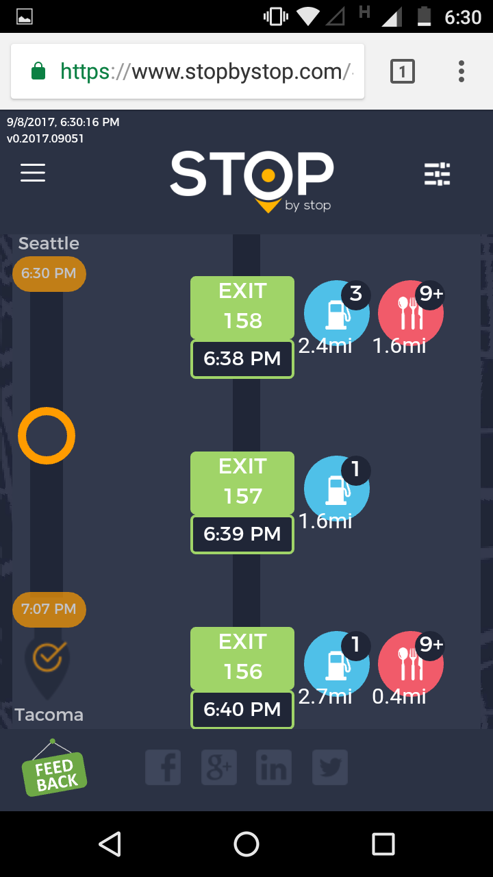 2. RoutePageRefesh. A. Navigate to test_server/ B. Type seat in the first textbox and pick Seattle from the dropdown. C. Type tac in the second textbox and pick Tacoma from the dropdown. D. Click View my trip. E. Route page should open showing exits with restaurants and gas station icons. F. Refresh the browser. Route page should open, NOT home page. Take screenshot. |