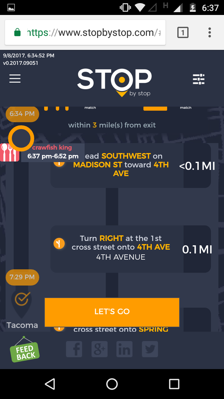 8. POISelectionGoToRoute. A. In the new browser tab open Seattle to Tacoma route. Click on first exit in the road line. Exit page should open. B. On the exit page click on the any item. POI page should open. </br/>C. On the POI page click Add to route button. POI selection popup should open. D. Click Add to route. Route page should open. E. On the sidebar there should be an icon to indicate the the place you picked. F. Click on Let's go button at the bottom of the screen. Google maps should open. Take a screenshot. |
