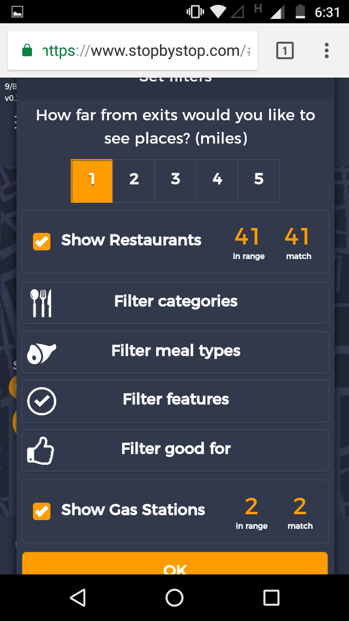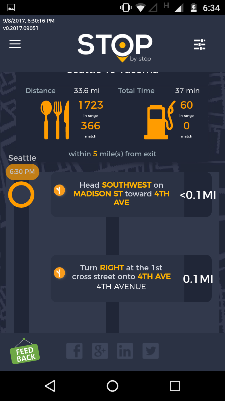 5. FiltersDistancePropagateToExit. A. Open Seattle to Tacoma route. B. Click on Filters and select 1 mile from exit. C. Close Filters popup and navigate to exit page. D. On the exit page open Filters popup and verify that distance settings (1 mile from exit) from route page are propagated. E. Take screenshot. |