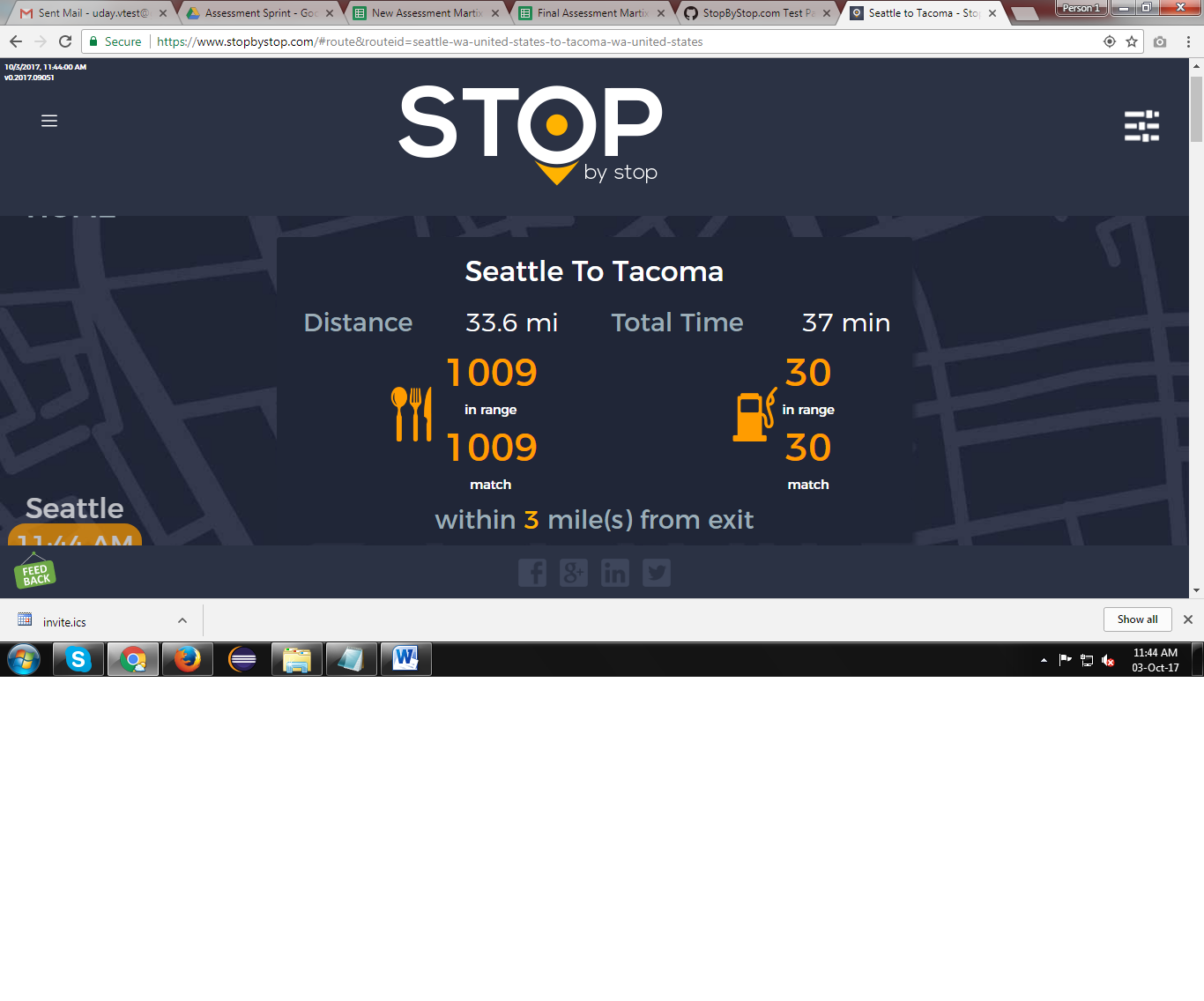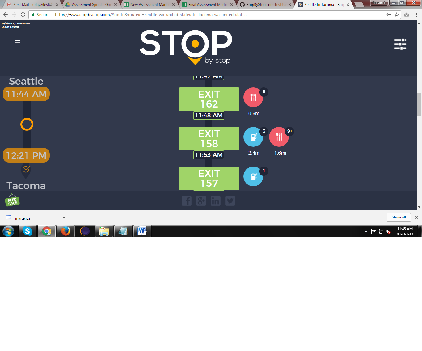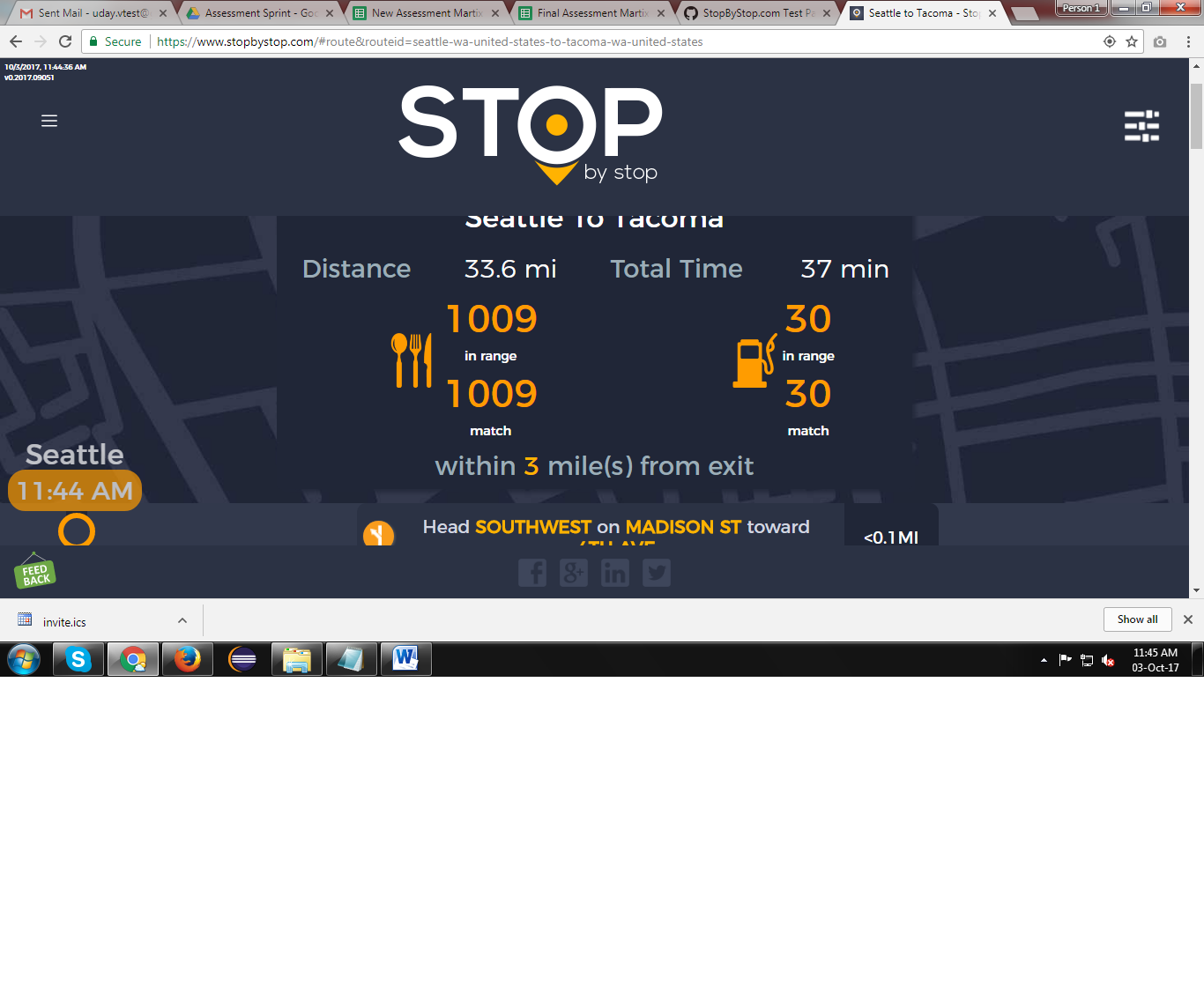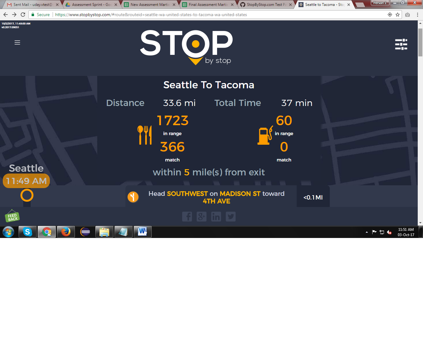 2. RoutePageRefesh. A. Navigate to test_server/ B. Type seat in the first textbox and pick Seattle from the dropdown. C. Type tac in the second textbox and pick Tacoma from the dropdown. D. Click View my trip. E. Route page should open showing exits with restaurants and gas station icons. F. Refresh the browser. Route page should open, NOT home page. Take screenshot. |
