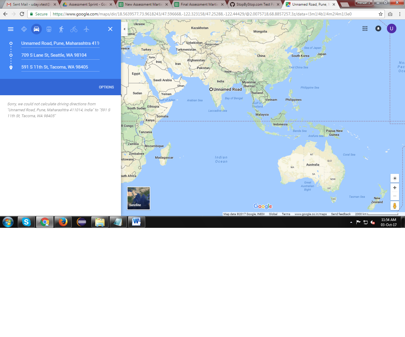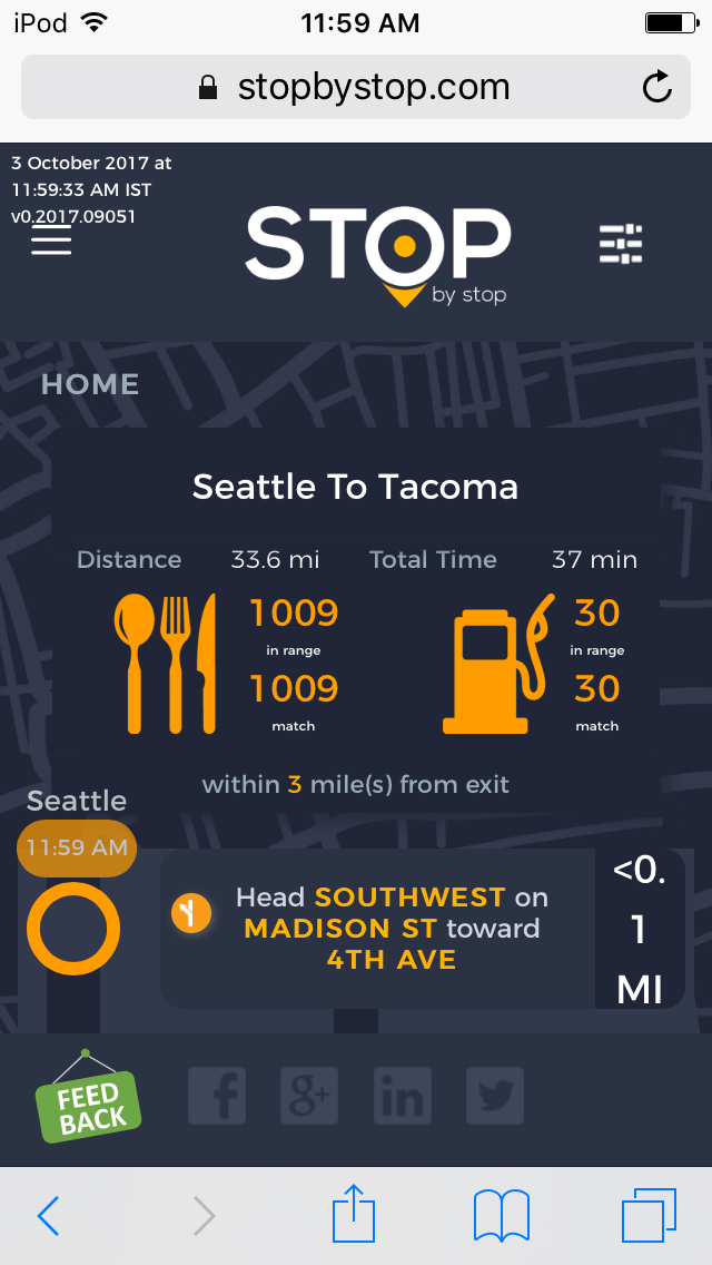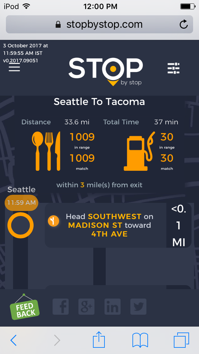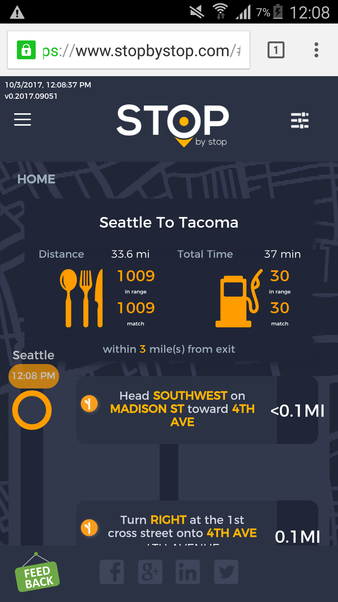 2. RoutePageRefesh. A. Navigate to test_server/ B. Type seat in the first textbox and pick Seattle from the dropdown. C. Type tac in the second textbox and pick Tacoma from the dropdown. D. Click View my trip. E. Route page should open showing exits with restaurants and gas station icons. F. Refresh the browser. Route page should open, NOT home page. Take screenshot. |
