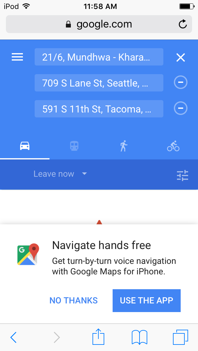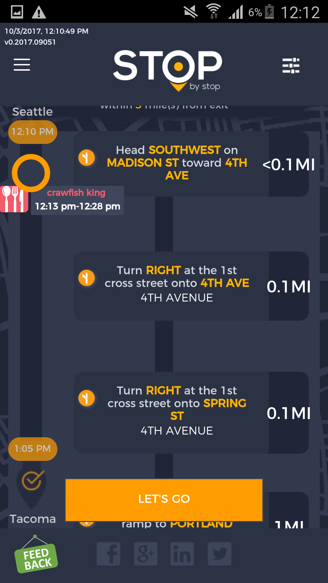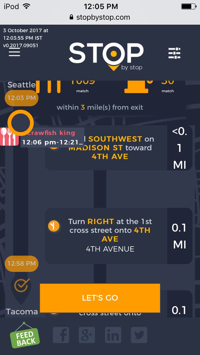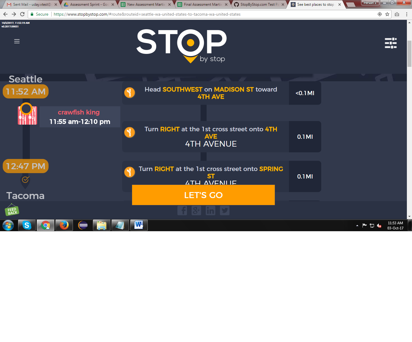 8. POISelectionGoToRoute. A. In the new browser tab open Seattle to Tacoma route. Click on first exit in the road line. Exit page should open. B. On the exit page click on the any item. POI page should open. </br/>C. On the POI page click Add to route button. POI selection popup should open. D. Click Add to route. Route page should open. E. On the sidebar there should be an icon to indicate the the place you picked. F. Click on Let's go button at the bottom of the screen. Google maps should open. Take a screenshot. |