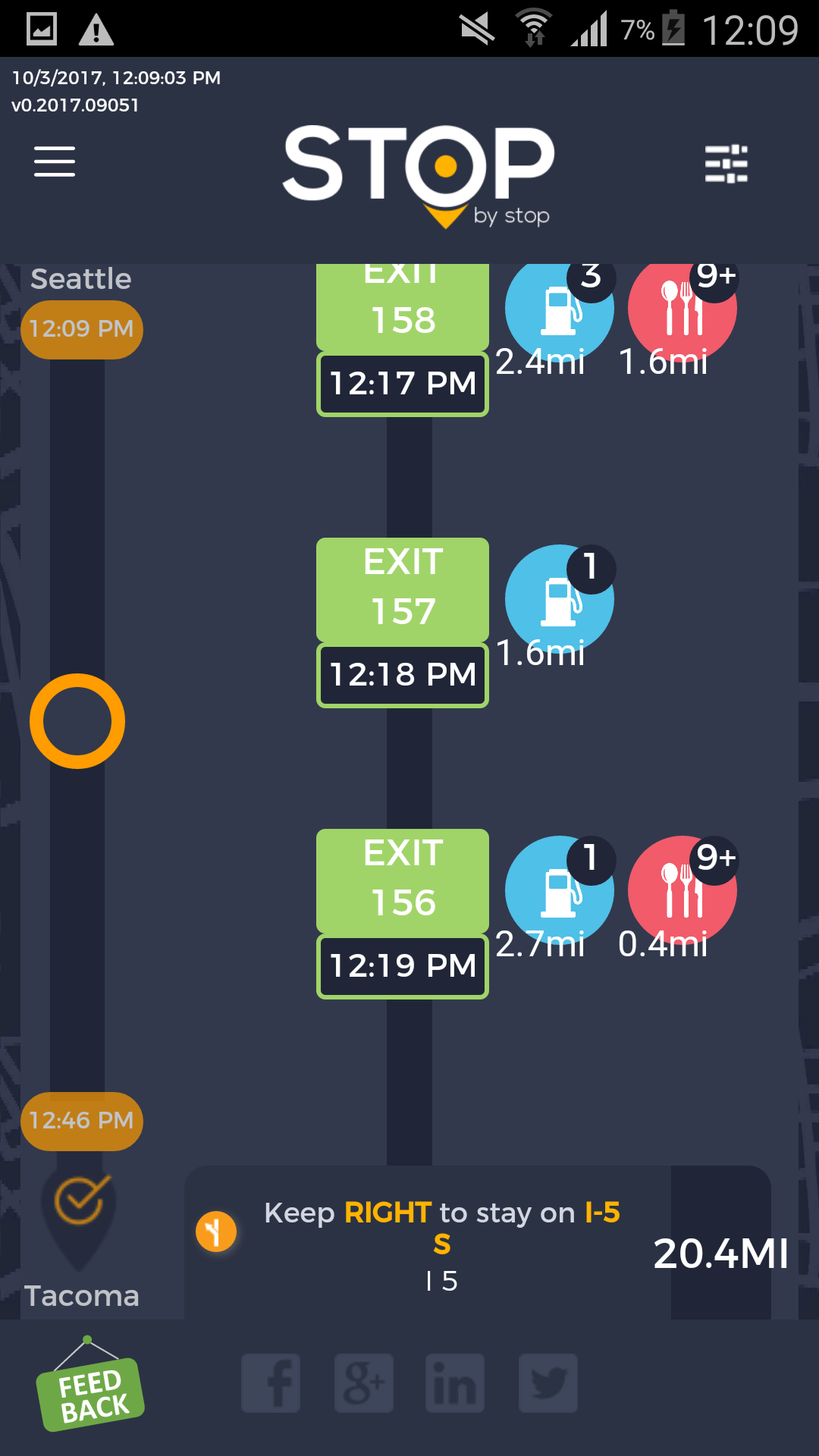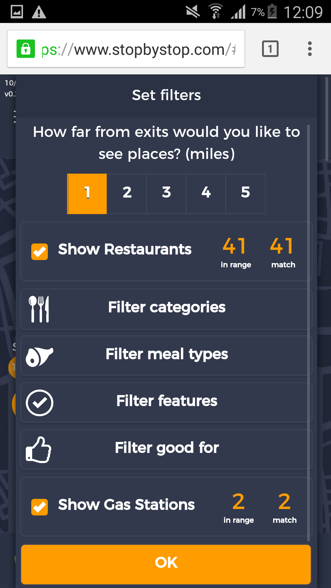 5. FiltersDistancePropagateToExit. A. Open Seattle to Tacoma route. B. Click on Filters and select 1 mile from exit. C. Close Filters popup and navigate to exit page. D. On the exit page open Filters popup and verify that distance settings (1 mile from exit) from route page are propagated. E. Take screenshot. |