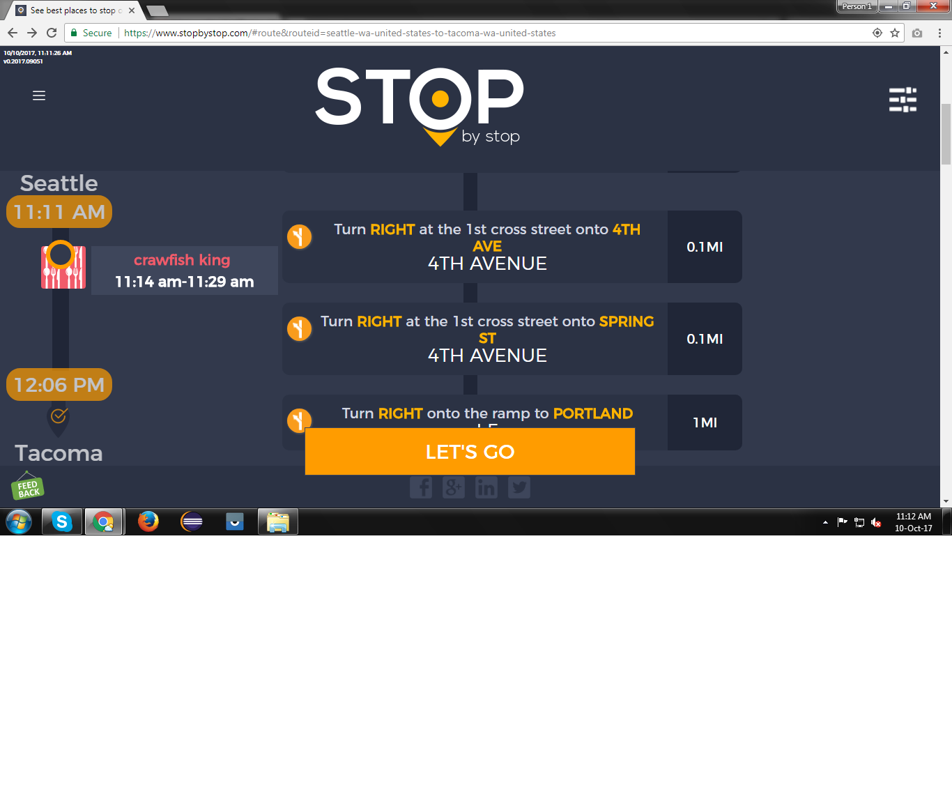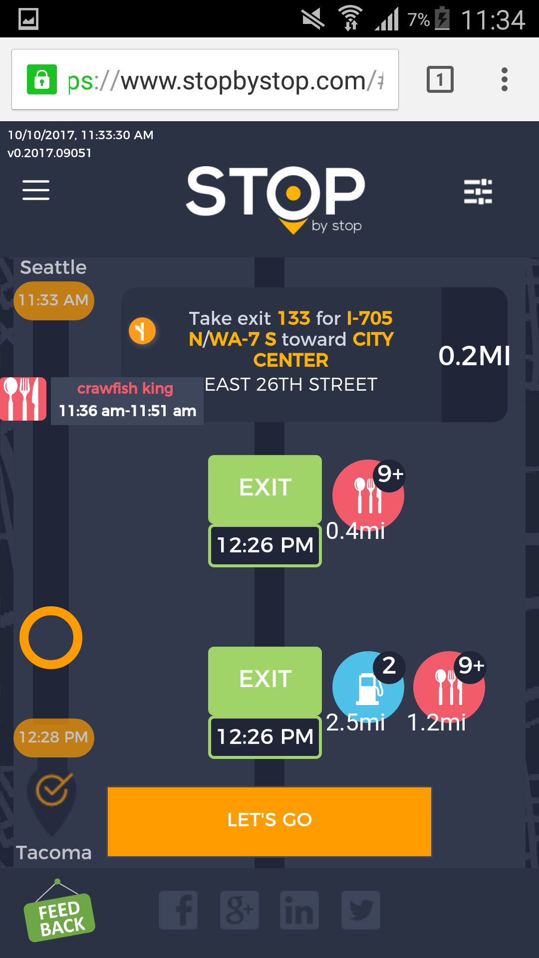 8. POISelectionGoToRoute. A. In the new browser tab open Seattle to Tacoma route. Click on first exit in the road line. Exit page should open. B. On the exit page click on the any item. POI page should open. </br/>C. On the POI page click Add to route button. POI selection popup should open. D. Click Add to route. Route page should open. E. On the sidebar there should be an icon to indicate the the place you picked. F. Click on Let's go button at the bottom of the screen. Google maps should open. Take a screenshot. |