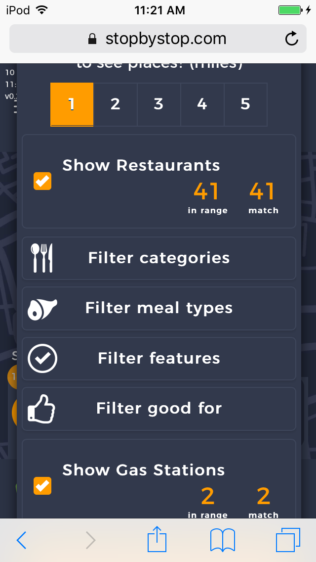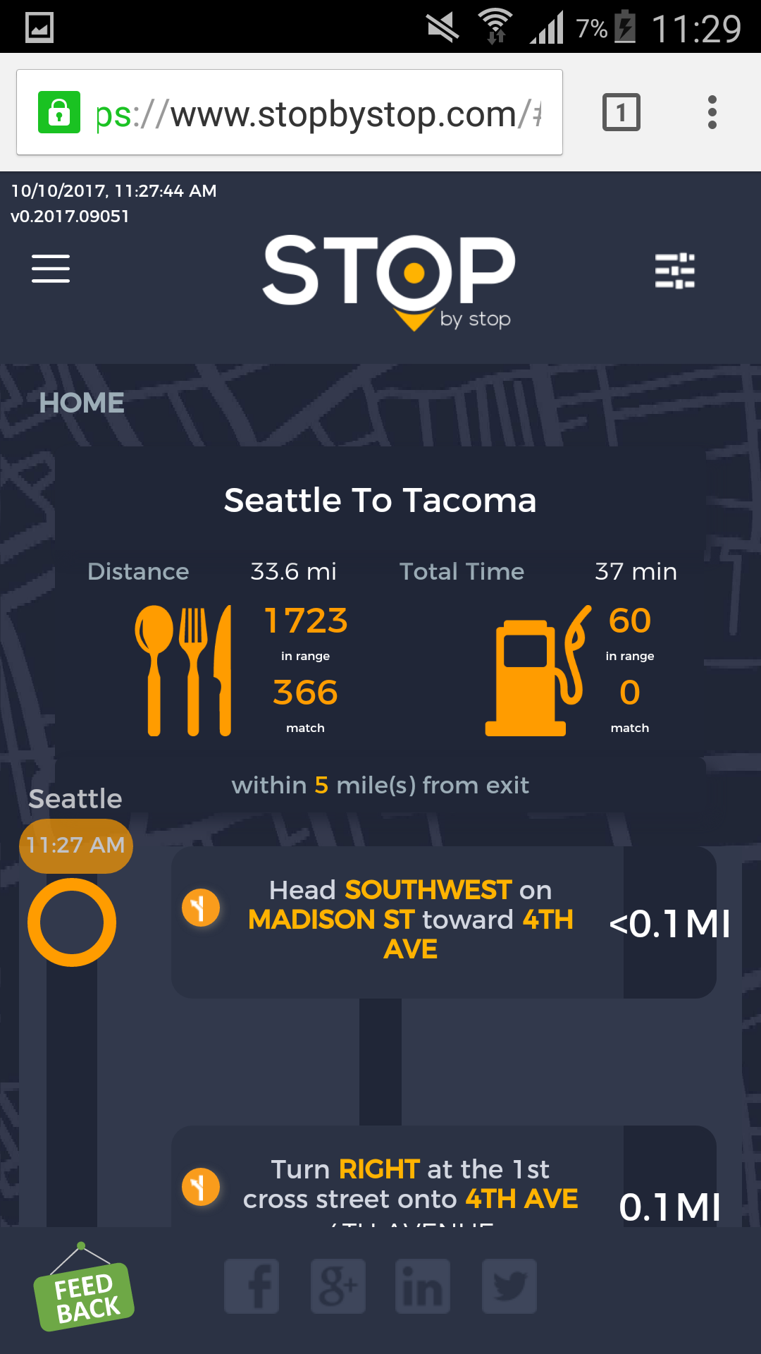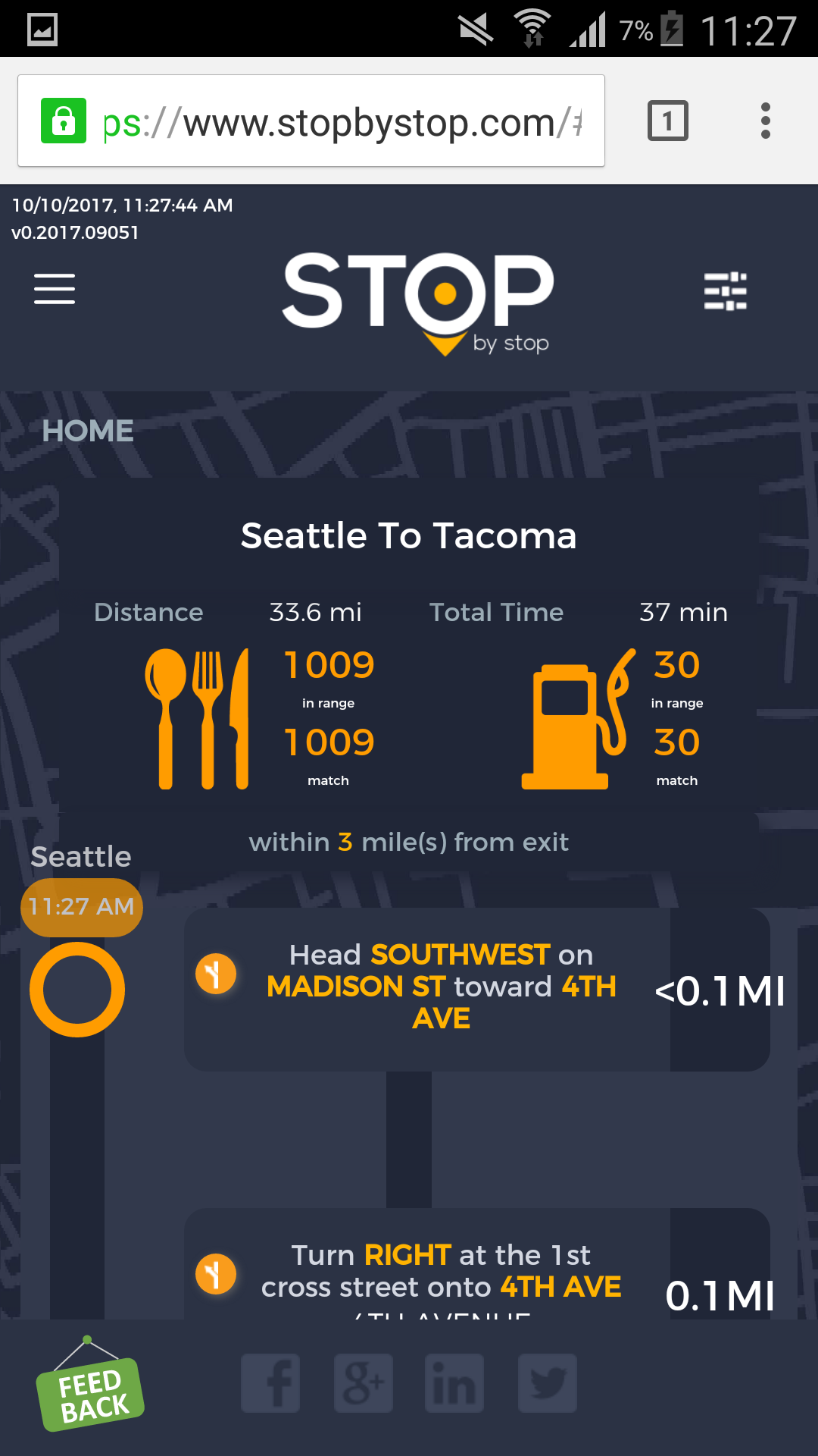 5. FiltersDistancePropagateToExit. A. Open Seattle to Tacoma route. B. Click on Filters and select 1 mile from exit. C. Close Filters popup and navigate to exit page. D. On the exit page open Filters popup and verify that distance settings (1 mile from exit) from route page are propagated. E. Take screenshot. |