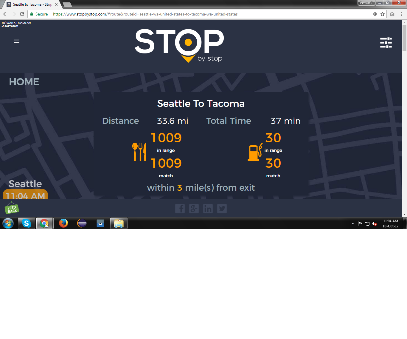 2. RoutePageRefesh. A. Navigate to test_server/ B. Type seat in the first textbox and pick Seattle from the dropdown. C. Type tac in the second textbox and pick Tacoma from the dropdown. D. Click View my trip. E. Route page should open showing exits with restaurants and gas station icons. F. Refresh the browser. Route page should open, NOT home page. Take screenshot. |
