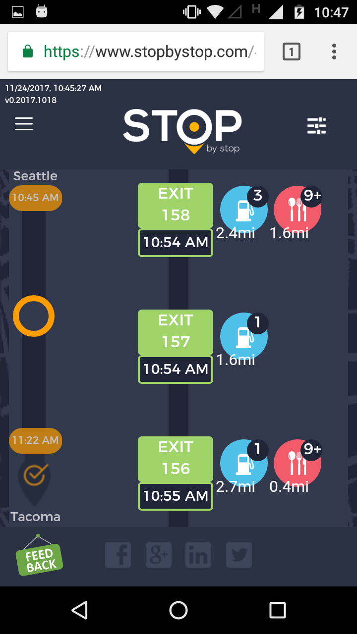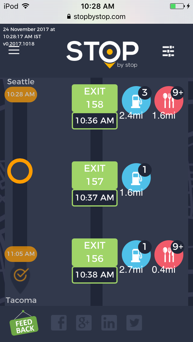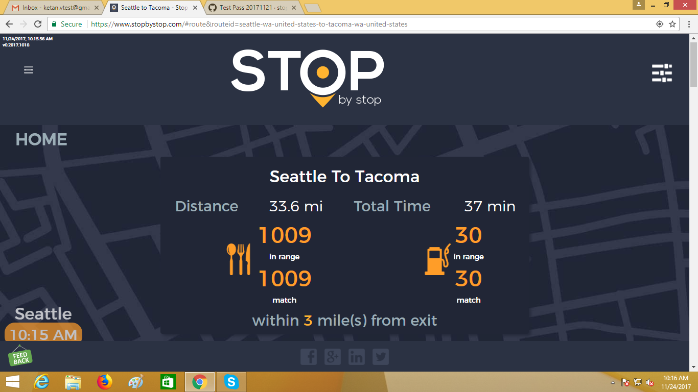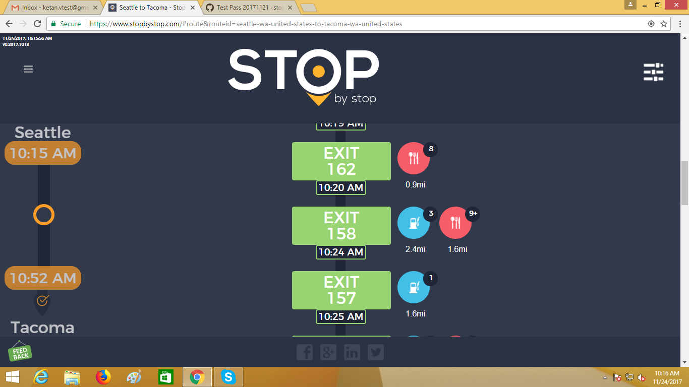 2. RoutePageRefesh. A. Navigate to test_server/ B. Type seat in the first textbox and pick Seattle from the dropdown. C. Type tac in the second textbox and pick Tacoma from the dropdown. D. Click View my trip. E. Route page should open showing exits with restaurants and gas station icons. F. Refresh the browser. Route page should open, NOT home page. Take screenshot. |