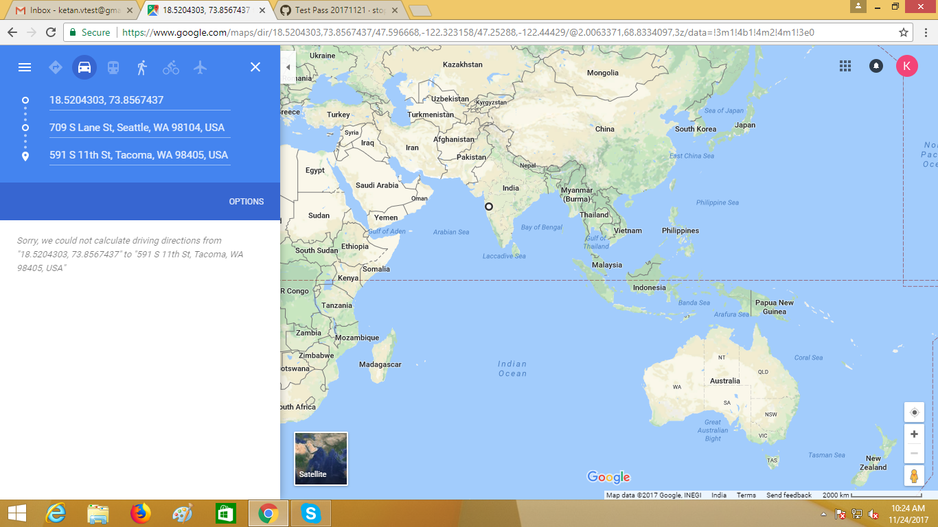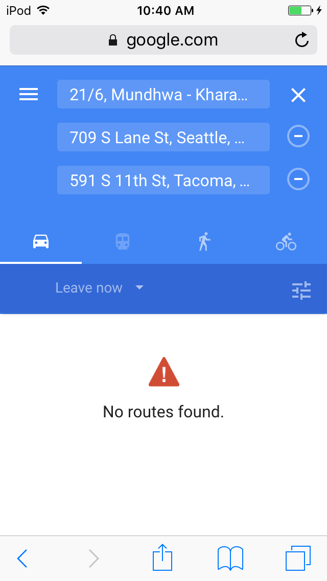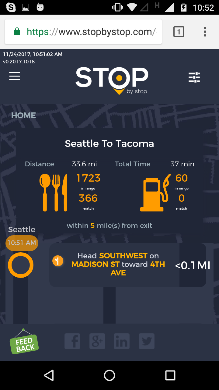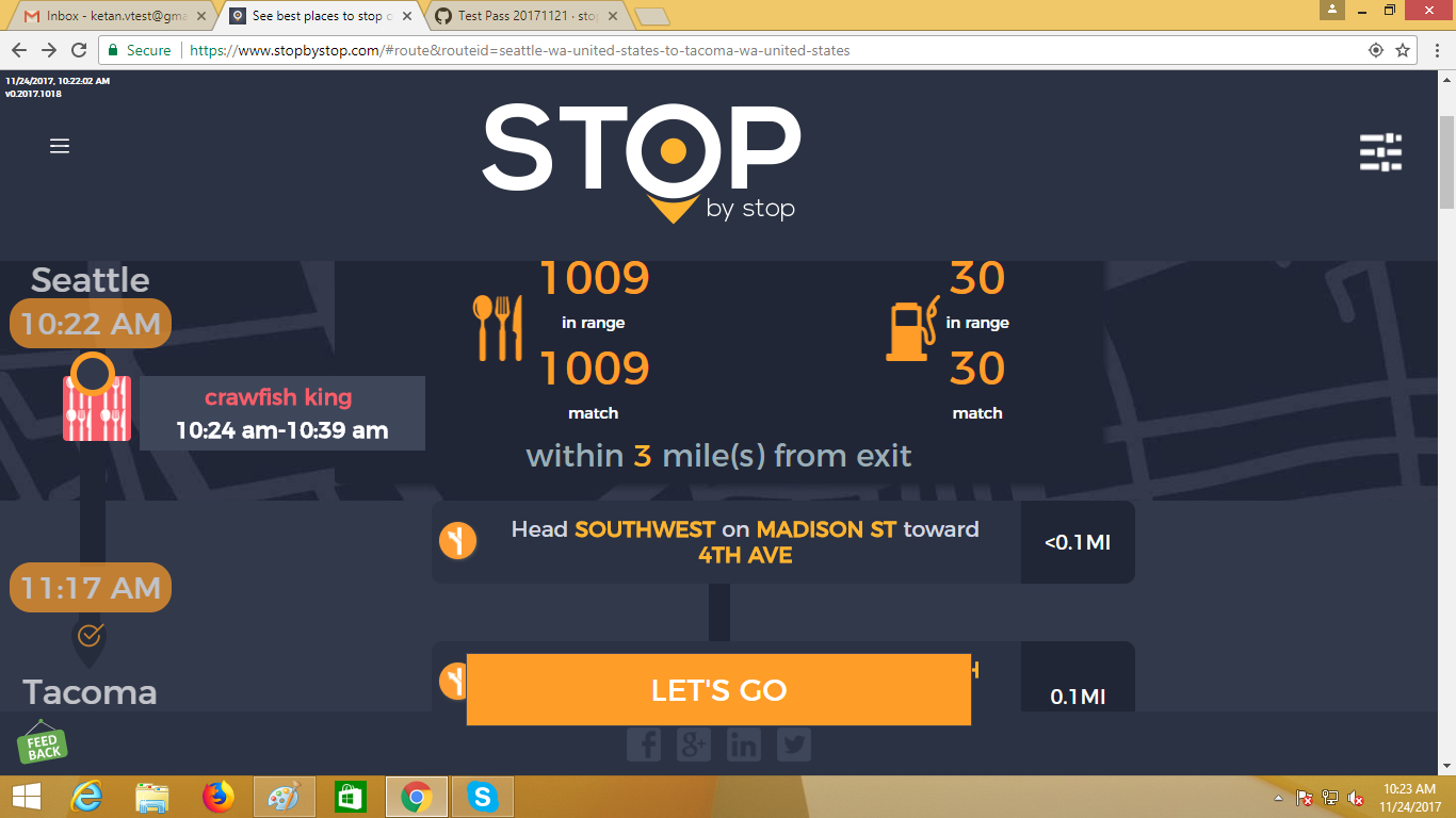 2. RoutePageRefesh. A. Navigate to test_server/ B. Type seat in the first textbox and pick Seattle from the dropdown. C. Type tac in the second textbox and pick Tacoma from the dropdown. D. Click View my trip. E. Route page should open showing exits with restaurants and gas station icons. F. Refresh the browser. Route page should open, NOT home page. Take screenshot. |