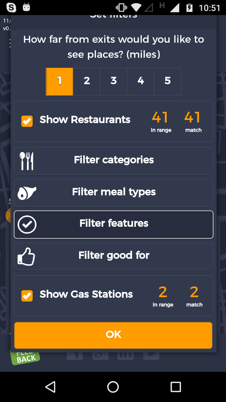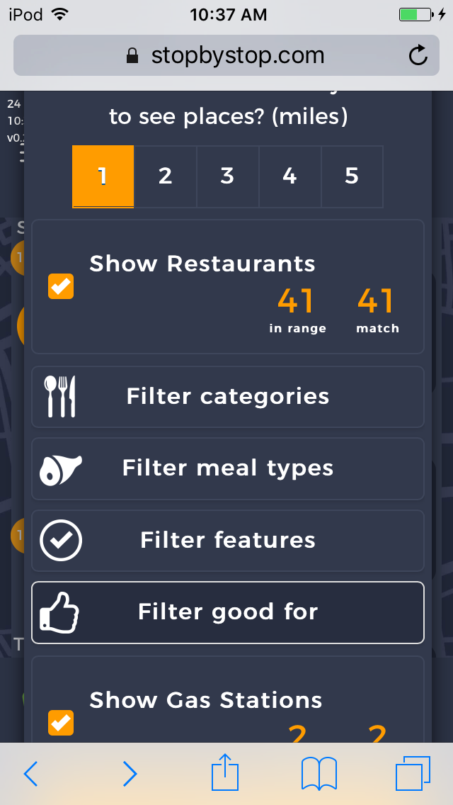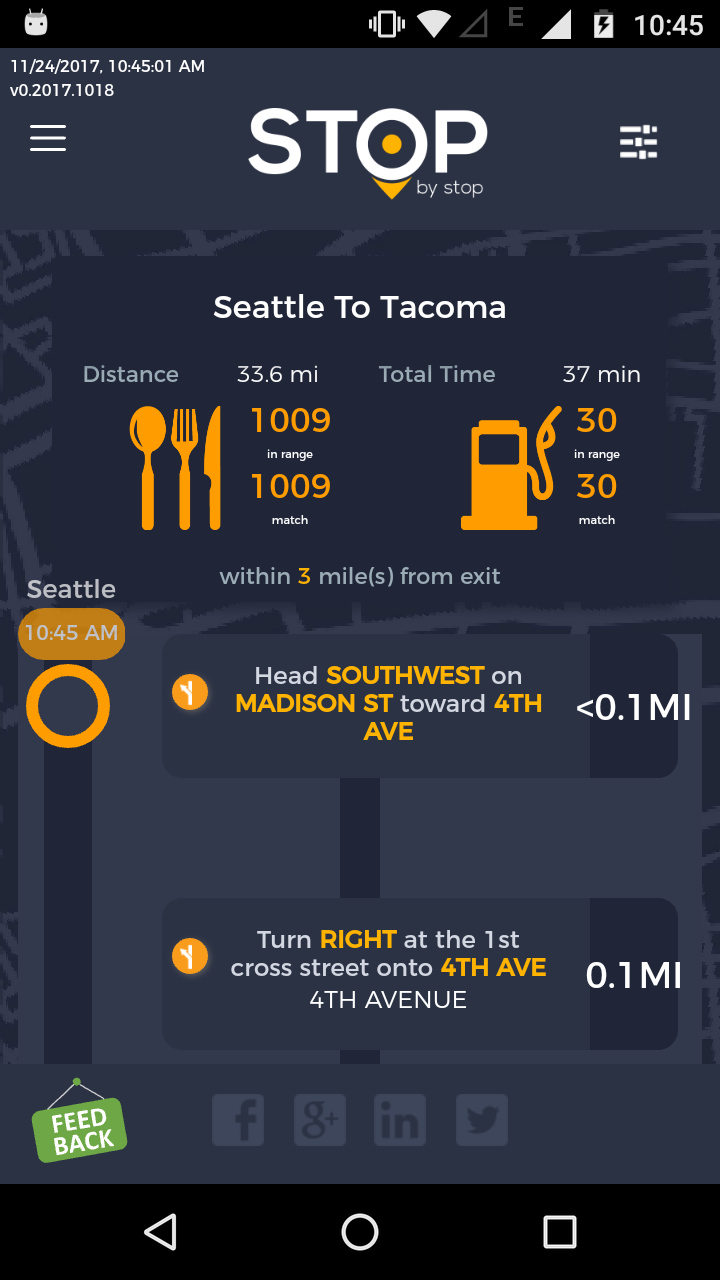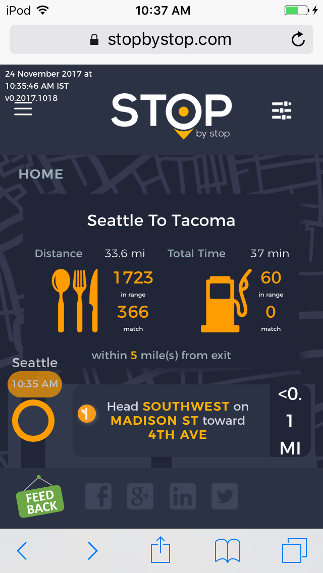 5. FiltersDistancePropagateToExit. A. Open Seattle to Tacoma route. B. Click on Filters and select 1 mile from exit. C. Close Filters popup and navigate to exit page. D. On the exit page open Filters popup and verify that distance settings (1 mile from exit) from route page are propagated. E. Take screenshot. |