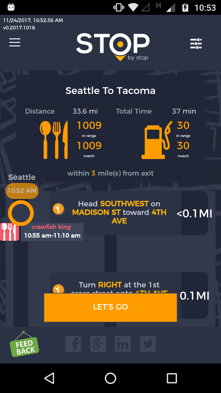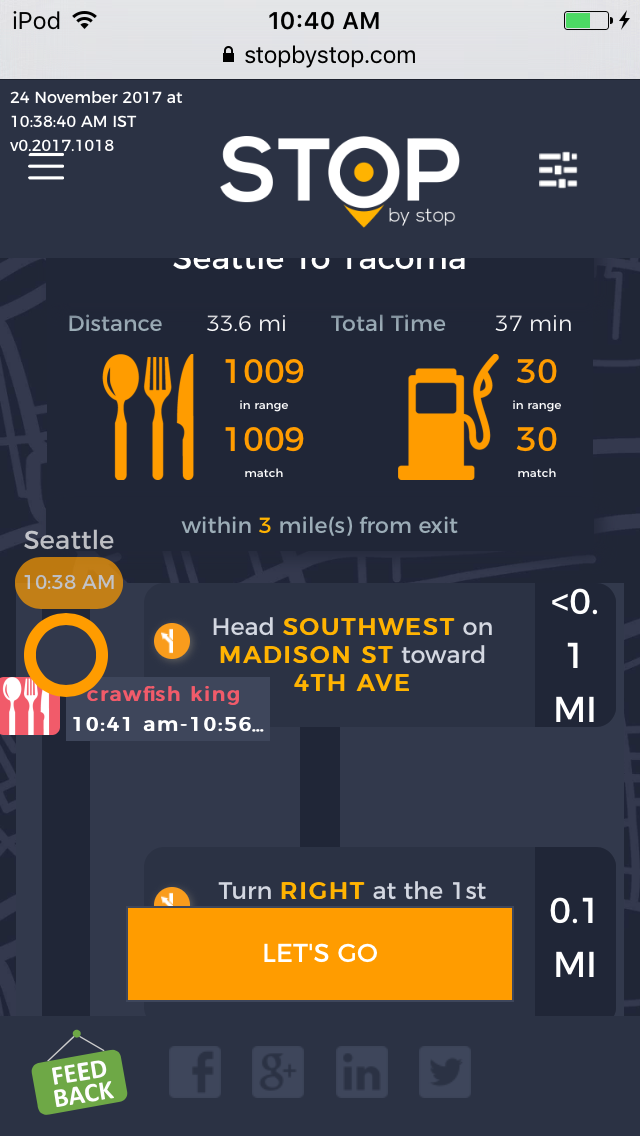 8. POISelectionGoToRoute. A. In the new browser tab open Seattle to Tacoma route. Click on first exit in the road line. Exit page should open. B. On the exit page click on the any item. POI page should open. </br/>C. On the POI page click Add to route button. POI selection popup should open. D. Click Add to route. Route page should open. E. On the sidebar there should be an icon to indicate the the place you picked. F. Click on Let's go button at the bottom of the screen. Google maps should open. Take a screenshot. |