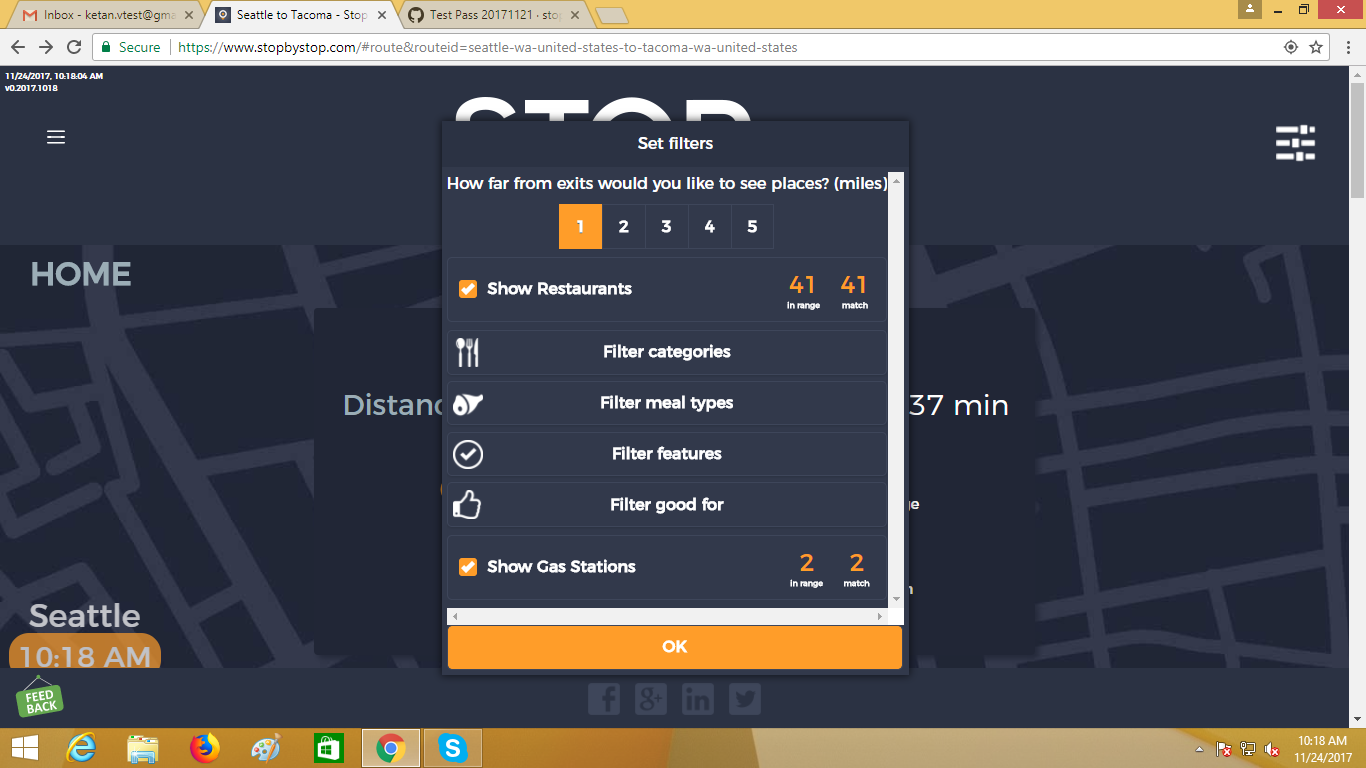 6. FiltersCategories. A. Navigate to test_server/route/47.68950,-122.03859-to-tacoma-wa-united-states. B. Click on Filters. C. Pick 5 miles from exit D. Unselect gas stations E. Leave restaurants selected. F. Click Filter categories select clear all, then select American(traditional) only. G. Click OK to close Filters. Take screenshot. |