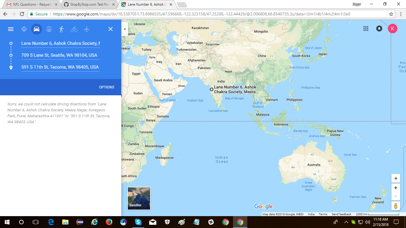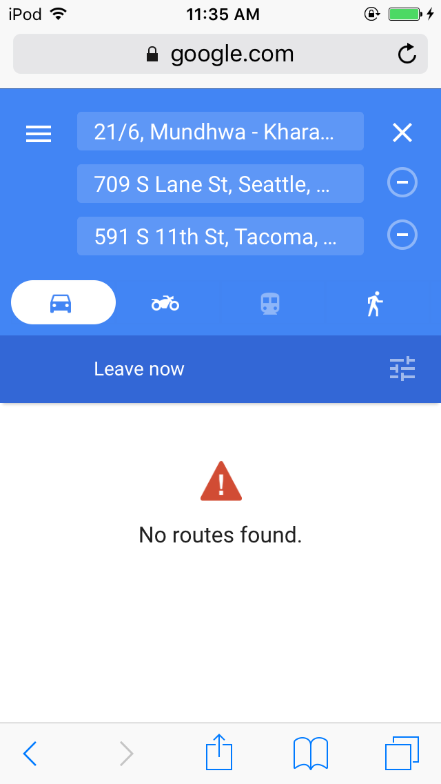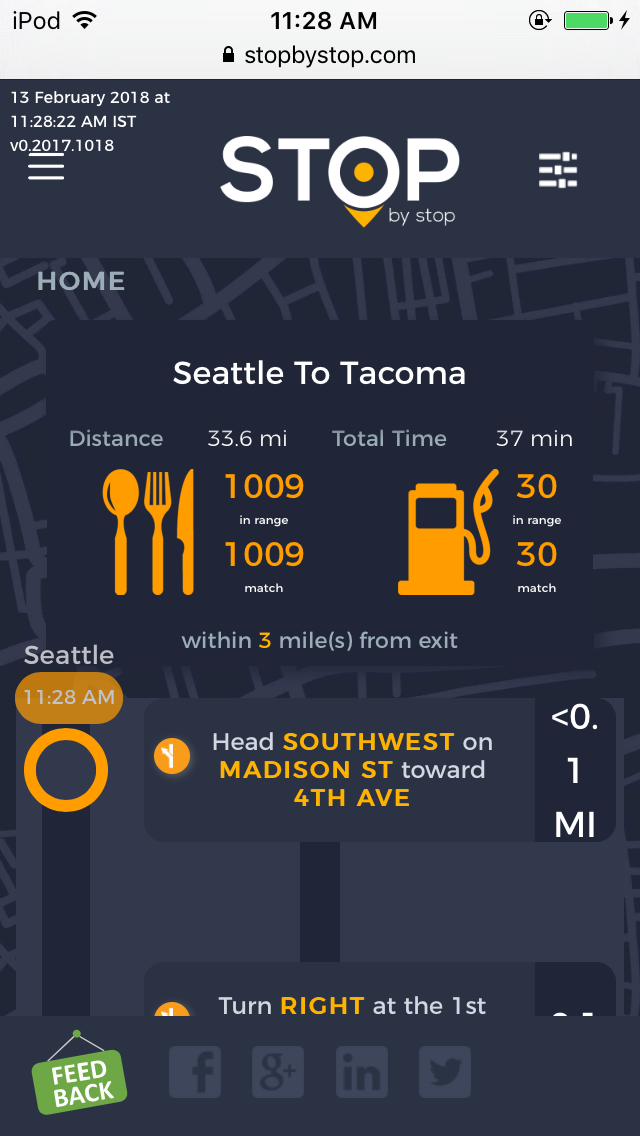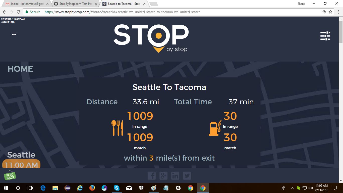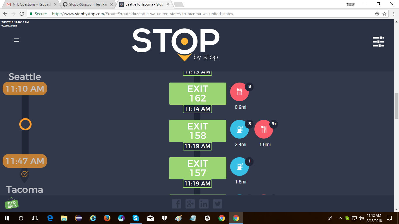 2. RoutePageRefesh. A. Navigate to test_server/ B. Type seat in the first textbox and pick Seattle from the dropdown. C. Type tac in the second textbox and pick Tacoma from the dropdown. D. Click View my trip. E. Route page should open showing exits with restaurants and gas station icons. F. Refresh the browser. Route page should open, NOT home page. Take screenshot. |