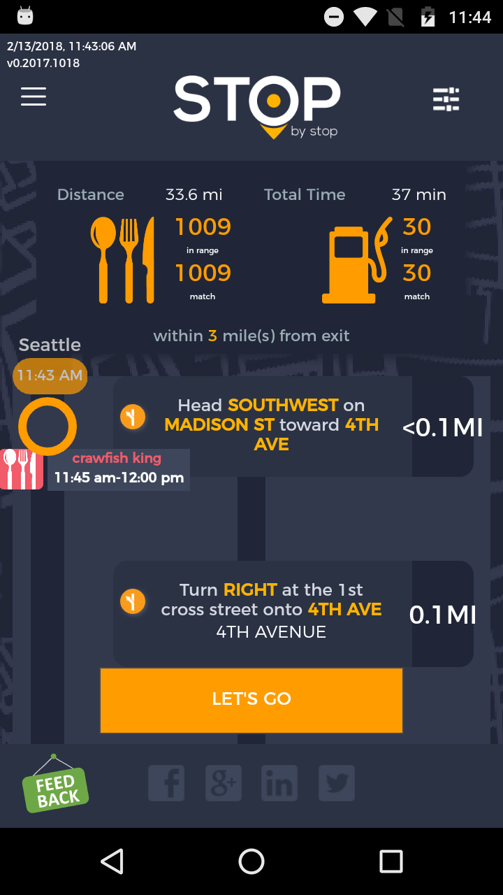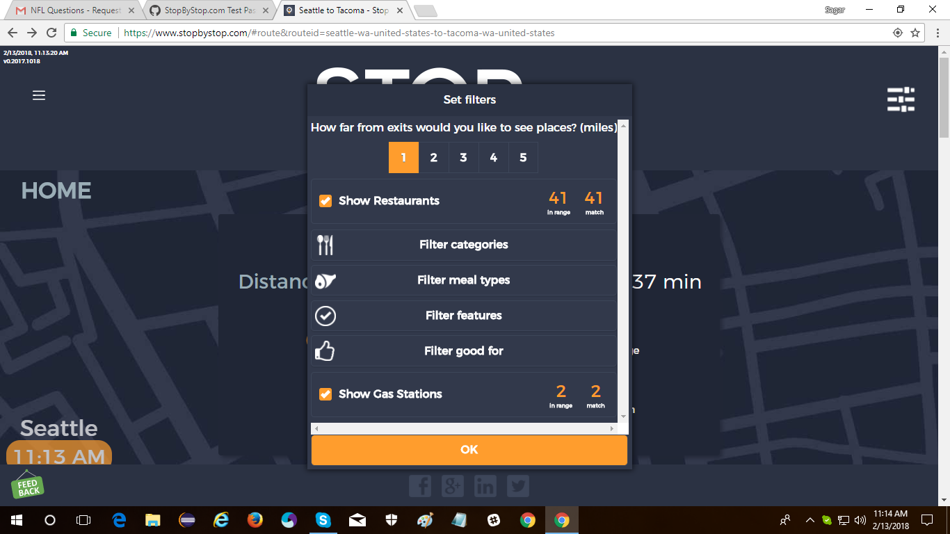 5. FiltersDistancePropagateToExit. A. Open Seattle to Tacoma route. B. Click on Filters and select 1 mile from exit. C. Close Filters popup and navigate to exit page. D. On the exit page open Filters popup and verify that distance settings (1 mile from exit) from route page are propagated. E. Take screenshot. |