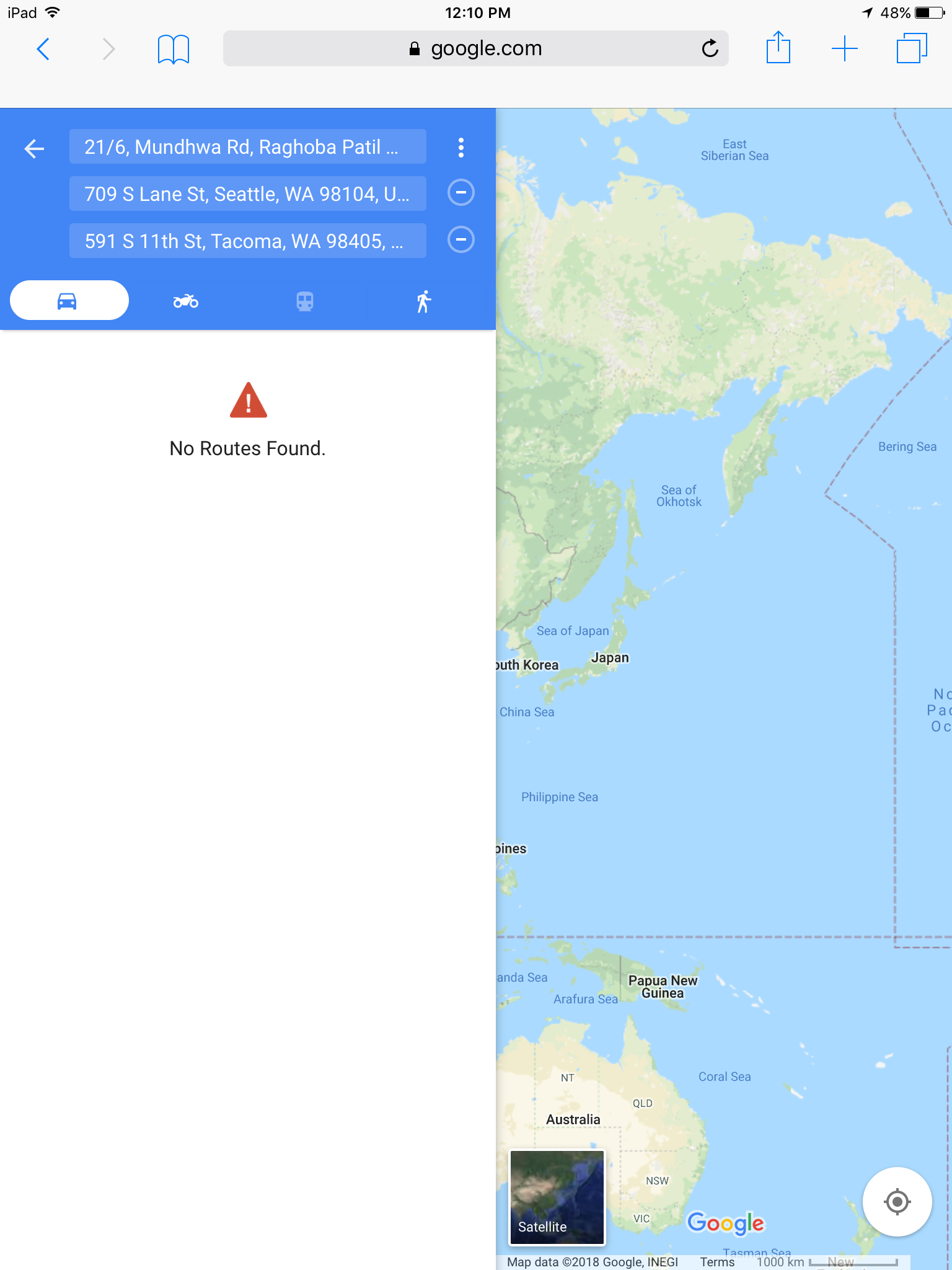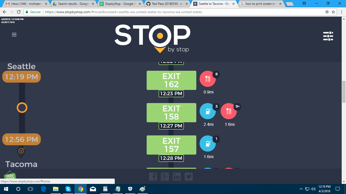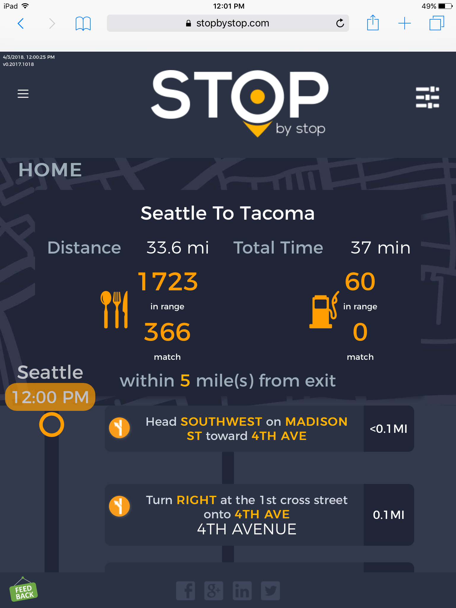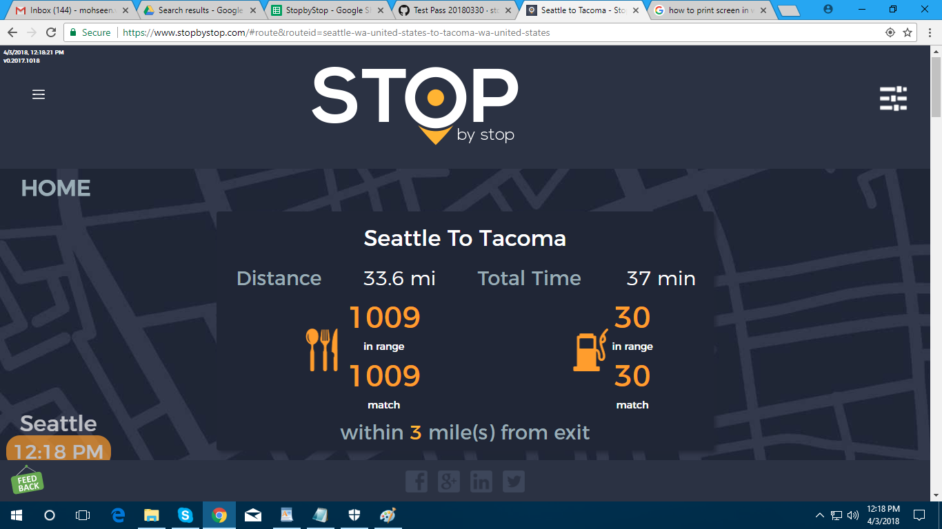 2. RoutePageRefesh. A. Navigate to test_server/ B. Type seat in the first textbox and pick Seattle from the dropdown. C. Type tac in the second textbox and pick Tacoma from the dropdown. D. Click View my trip. E. Route page should open showing exits with restaurants and gas station icons. F. Refresh the browser. Route page should open, NOT home page. Take screenshot. |