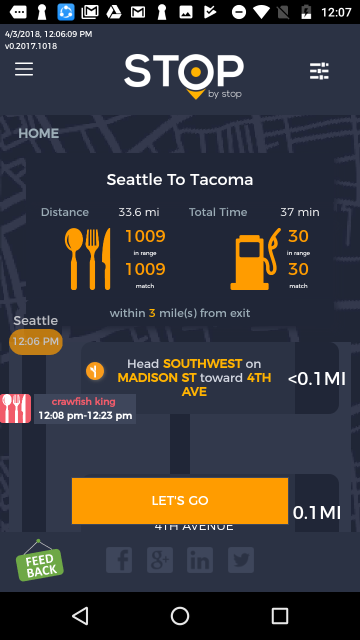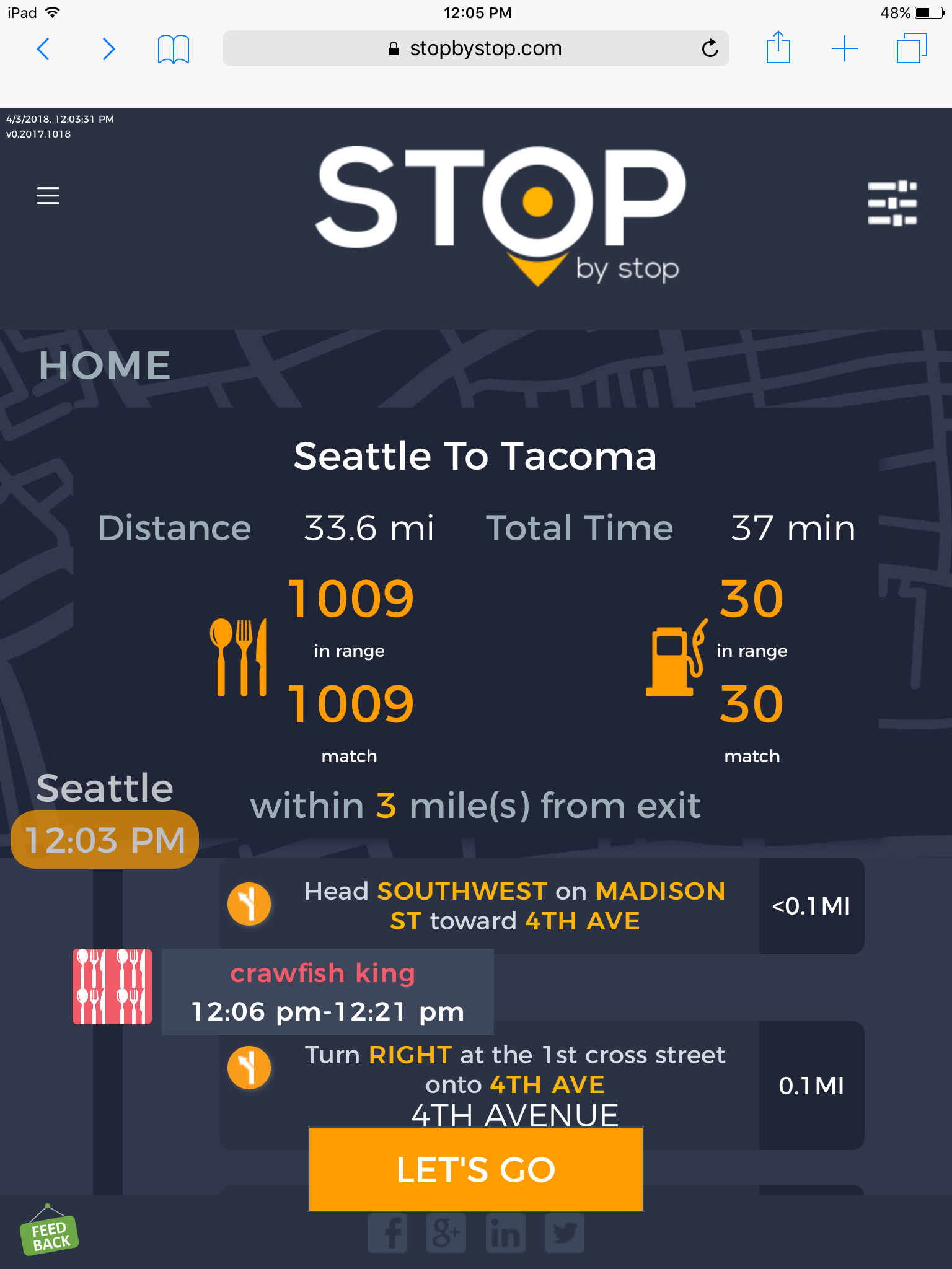 8. POISelectionGoToRoute. A. In the new browser tab open Seattle to Tacoma route. Click on first exit in the road line. Exit page should open. B. On the exit page click on the any item. POI page should open. </br/>C. On the POI page click Add to route button. POI selection popup should open. D. Click Add to route. Route page should open. E. On the sidebar there should be an icon to indicate the the place you picked. F. Click on Let's go button at the bottom of the screen. Google maps should open. Take a screenshot. |