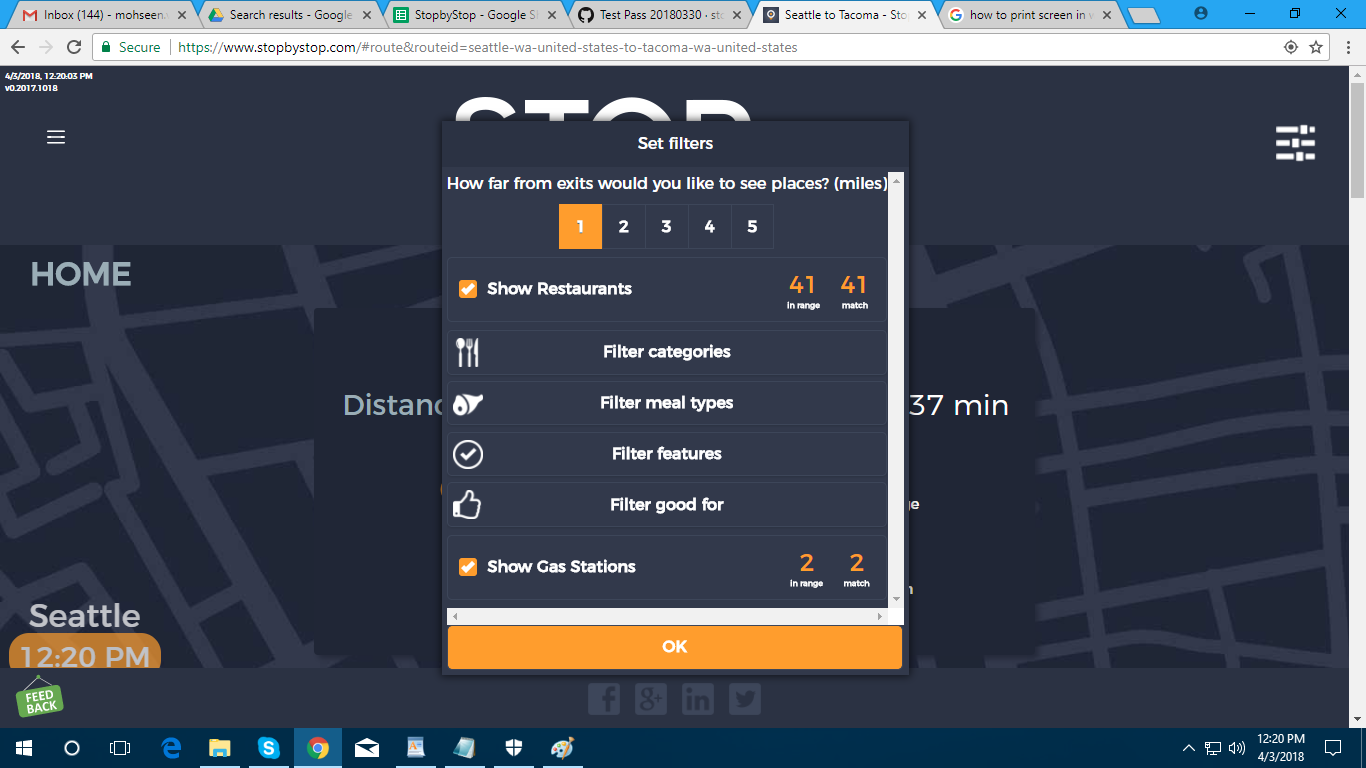 6. FiltersCategories. A. Navigate to test_server/route/47.68950,-122.03859-to-tacoma-wa-united-states. B. Click on Filters. C. Pick 5 miles from exit D. Unselect gas stations E. Leave restaurants selected. F. Click Filter categories select clear all, then select American(traditional) only. G. Click OK to close Filters. Take screenshot. |