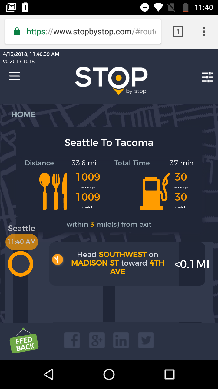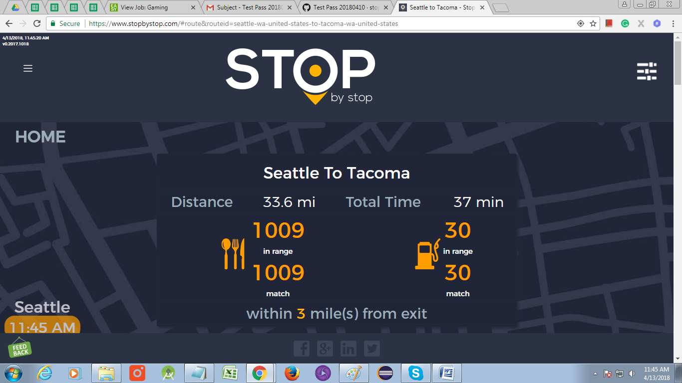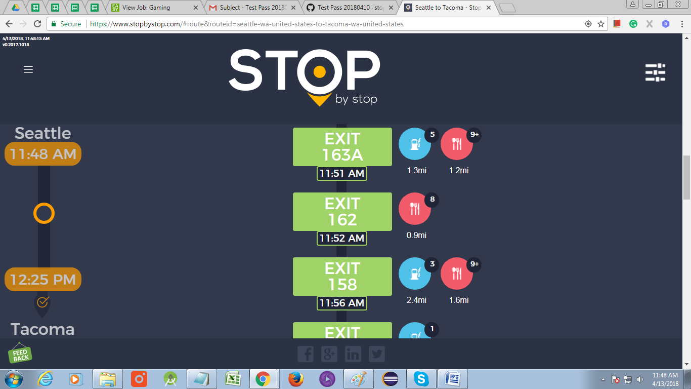 2. RoutePageRefesh. A. Navigate to test_server/ B. Type seat in the first textbox and pick Seattle from the dropdown. C. Type tac in the second textbox and pick Tacoma from the dropdown. D. Click View my trip. E. Route page should open showing exits with restaurants and gas station icons. F. Refresh the browser. Route page should open, NOT home page. Take screenshot. |