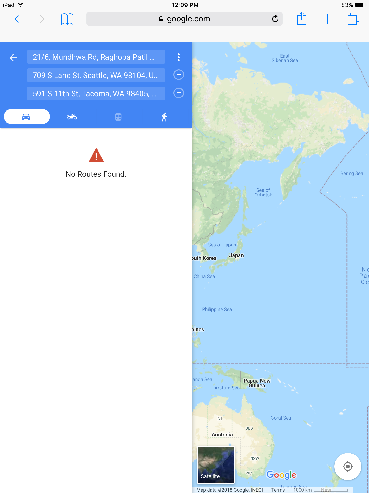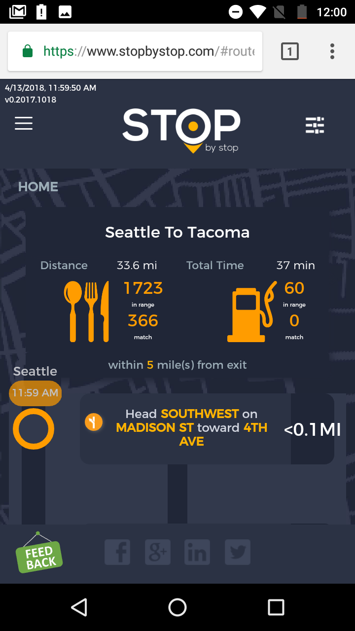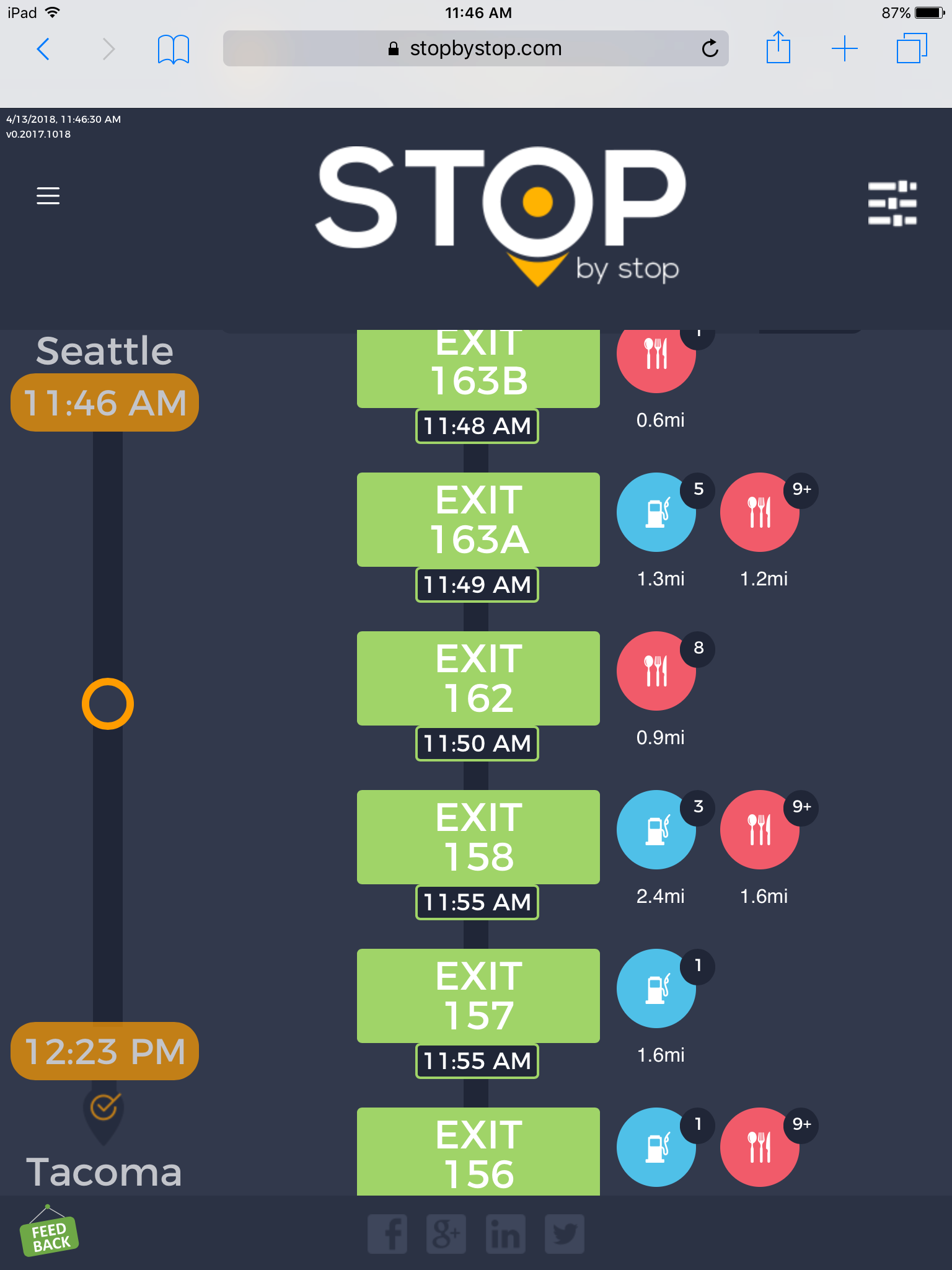2. RoutePageRefesh. A. Navigate to test_server/ B. Type seat in the first textbox and pick Seattle from the dropdown. C. Type tac in the second textbox and pick Tacoma from the dropdown. D. Click View my trip. E. Route page should open showing exits with restaurants and gas station icons. F. Refresh the browser. Route page should open, NOT home page. Take screenshot. |