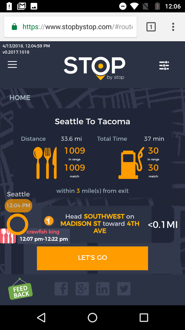 8. POISelectionGoToRoute. A. In the new browser tab open Seattle to Tacoma route. Click on first exit in the road line. Exit page should open. B. On the exit page click on the any item. POI page should open. </br/>C. On the POI page click Add to route button. POI selection popup should open. D. Click Add to route. Route page should open. E. On the sidebar there should be an icon to indicate the the place you picked. F. Click on Let's go button at the bottom of the screen. Google maps should open. Take a screenshot. |