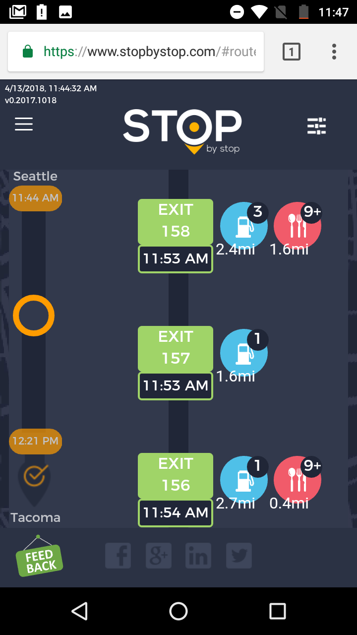 4. ExitPagesNavigation. A. Navigate to test_server/ B. Type Seattle to Tacoma route and navigate. C. Click on first exit. Verify that exit page opens and both - gas stations and restaurants are shown. Click back button in the browser to go back. D. Click on restaurant icon for the same exit and verify that same exit opens, but only restaurants are shown. Go back. E. Click on gas station icon for the same exit and verify that same exit opens, but only gas stations are shown. F. Verify that clicking on Phone icon opens Phone application. Some of the items (but not all of them) will have Yelp icon displayed next to them. Verify that clicking on Yelp icon navigates to Yelp website. Take a screenshot from Yelp website. |