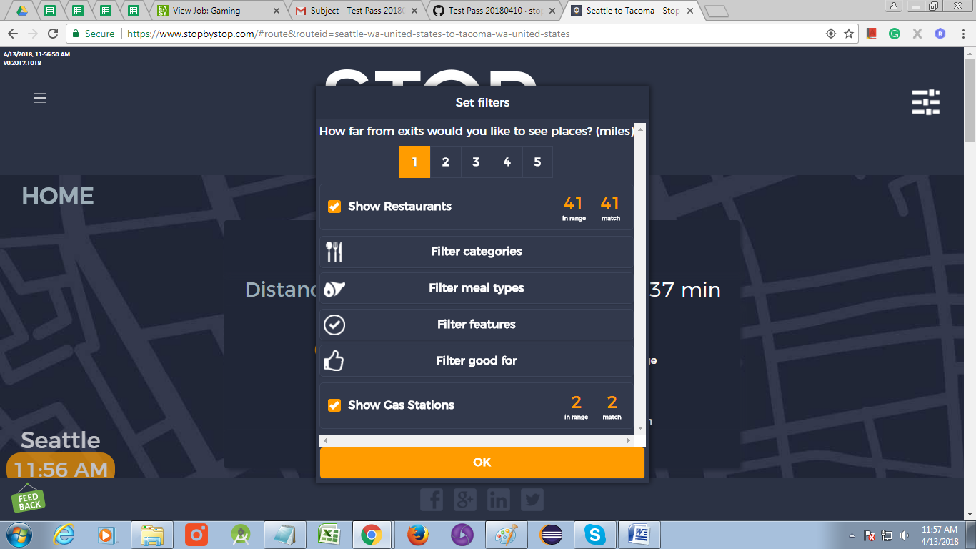 5. FiltersDistancePropagateToExit. A. Open Seattle to Tacoma route. B. Click on Filters and select 1 mile from exit. C. Close Filters popup and navigate to exit page. D. On the exit page open Filters popup and verify that distance settings (1 mile from exit) from route page are propagated. E. Take screenshot. |