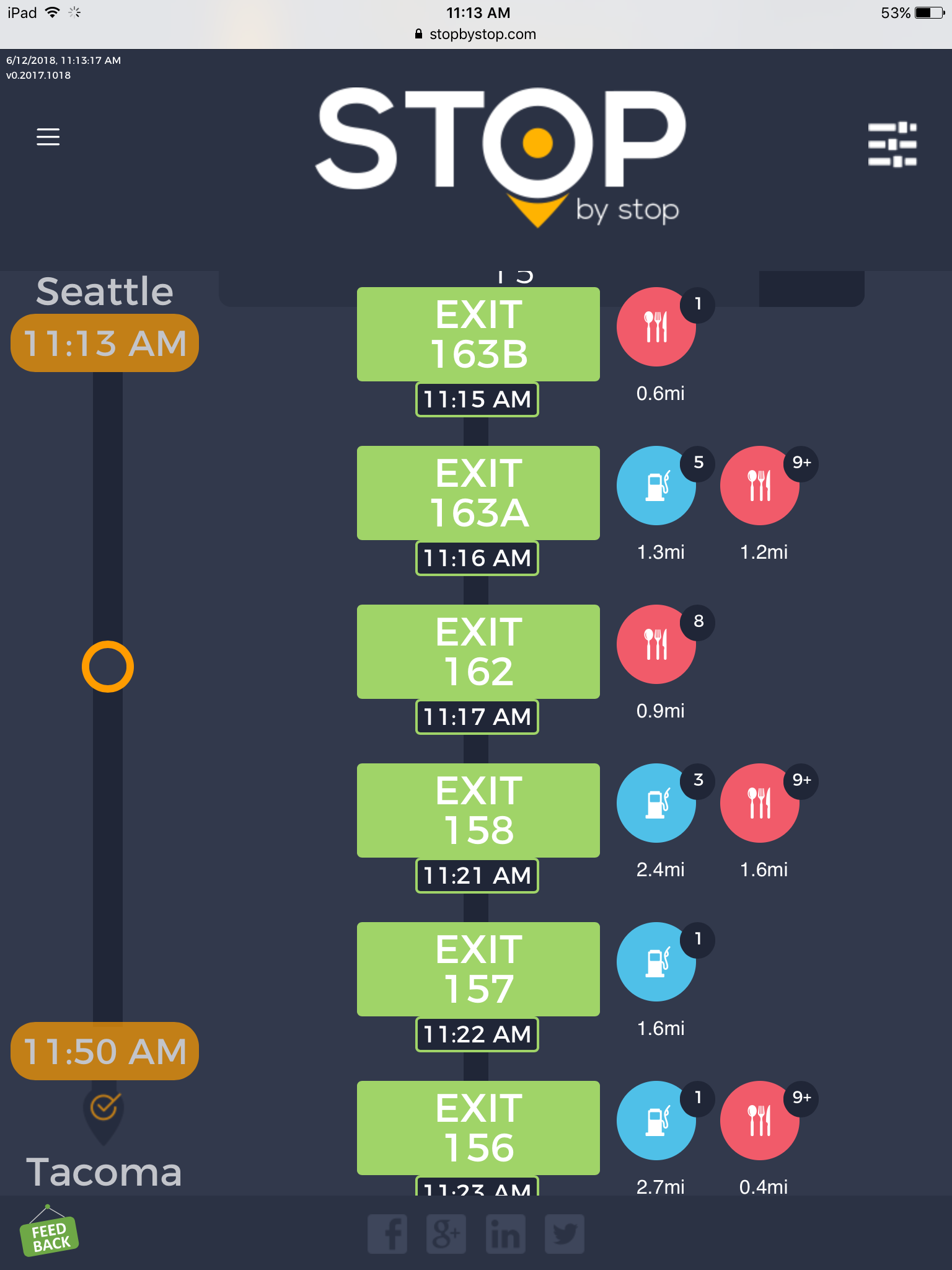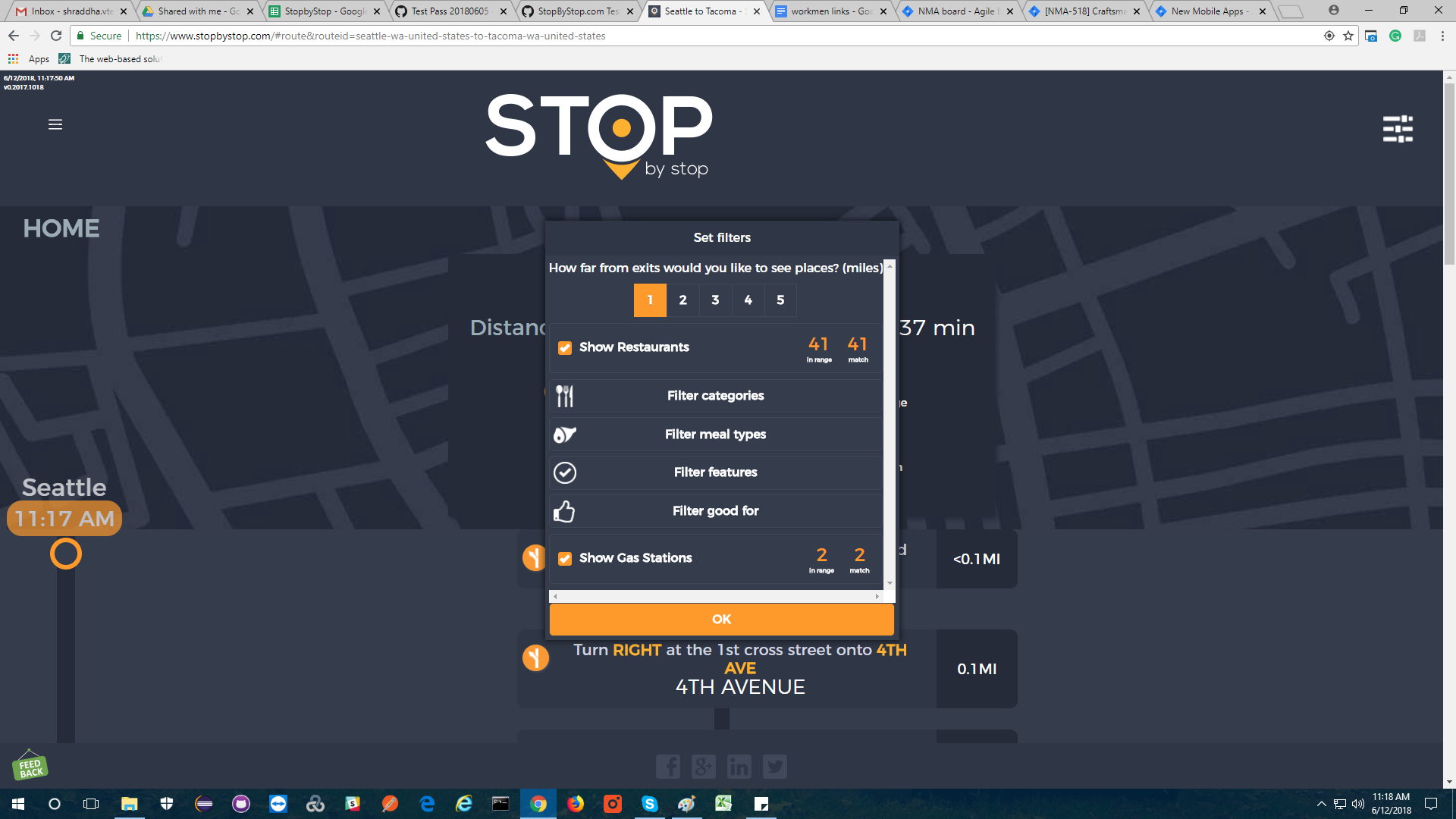 5. FiltersDistancePropagateToExit. A. Open Seattle to Tacoma route. B. Click on Filters and select 1 mile from exit. C. Close Filters popup and navigate to exit page. D. On the exit page open Filters popup and verify that distance settings (1 mile from exit) from route page are propagated. E. Take screenshot. |