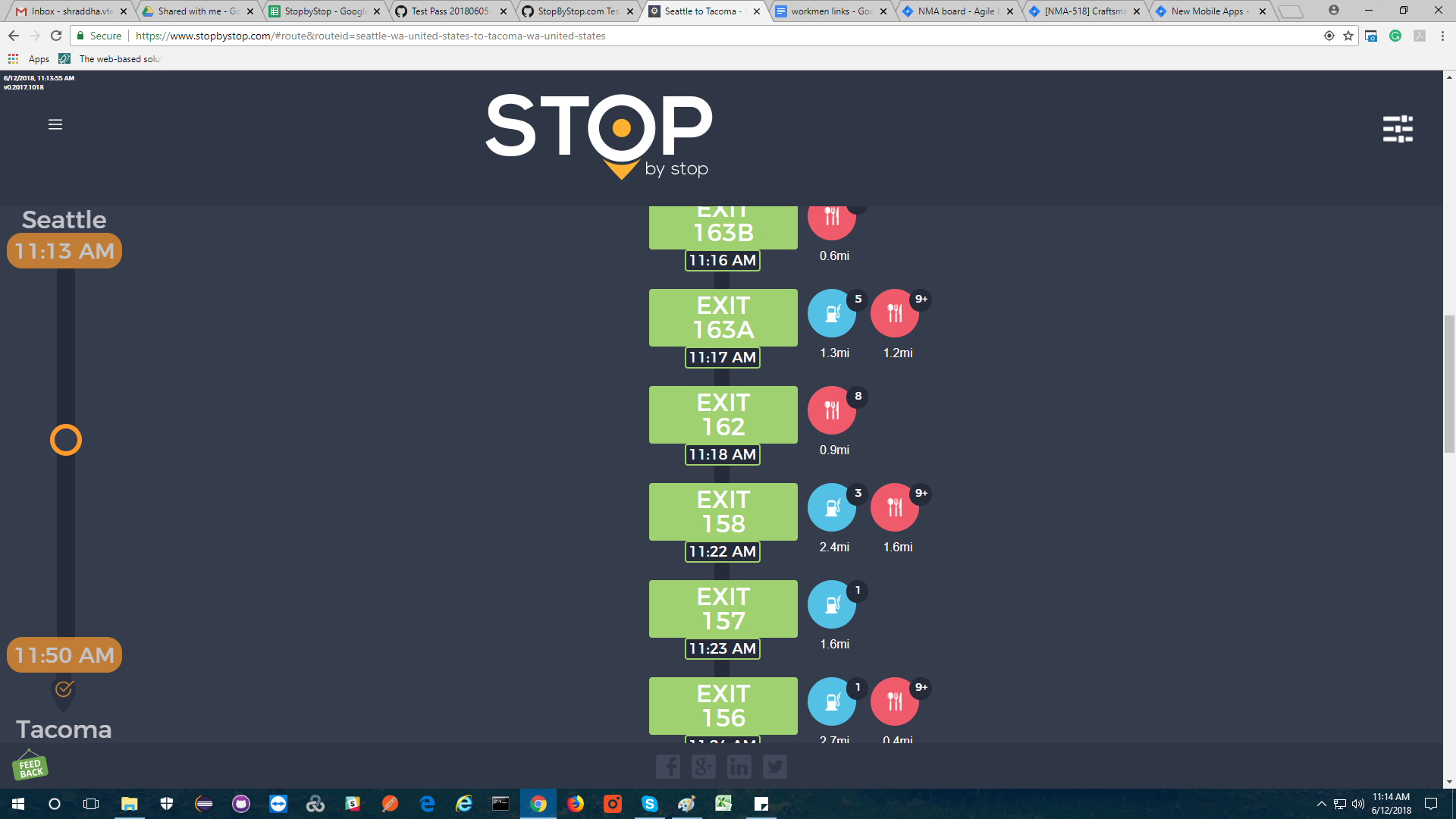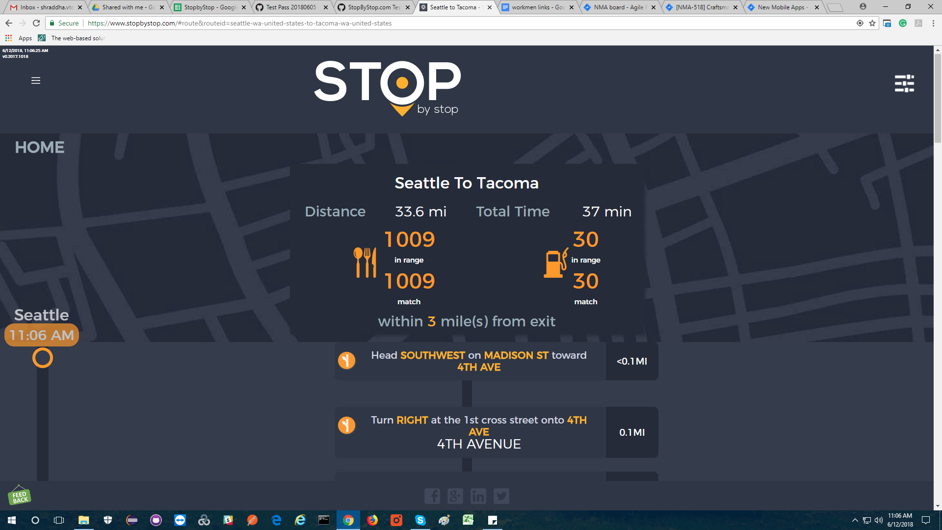 2. RoutePageRefesh. A. Navigate to test_server/ B. Type seat in the first textbox and pick Seattle from the dropdown. C. Type tac in the second textbox and pick Tacoma from the dropdown. D. Click View my trip. E. Route page should open showing exits with restaurants and gas station icons. F. Refresh the browser. Route page should open, NOT home page. Take screenshot. |
