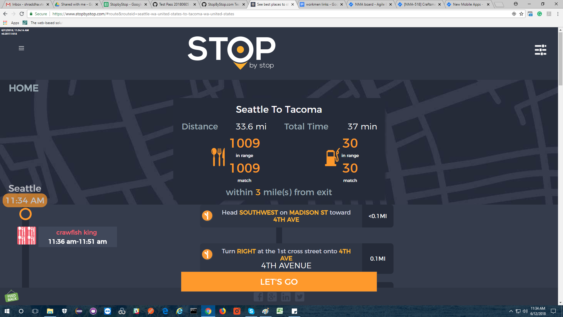 8. POISelectionGoToRoute. A. In the new browser tab open Seattle to Tacoma route. Click on first exit in the road line. Exit page should open. B. On the exit page click on the any item. POI page should open. </br/>C. On the POI page click Add to route button. POI selection popup should open. D. Click Add to route. Route page should open. E. On the sidebar there should be an icon to indicate the the place you picked. F. Click on Let's go button at the bottom of the screen. Google maps should open. Take a screenshot. |