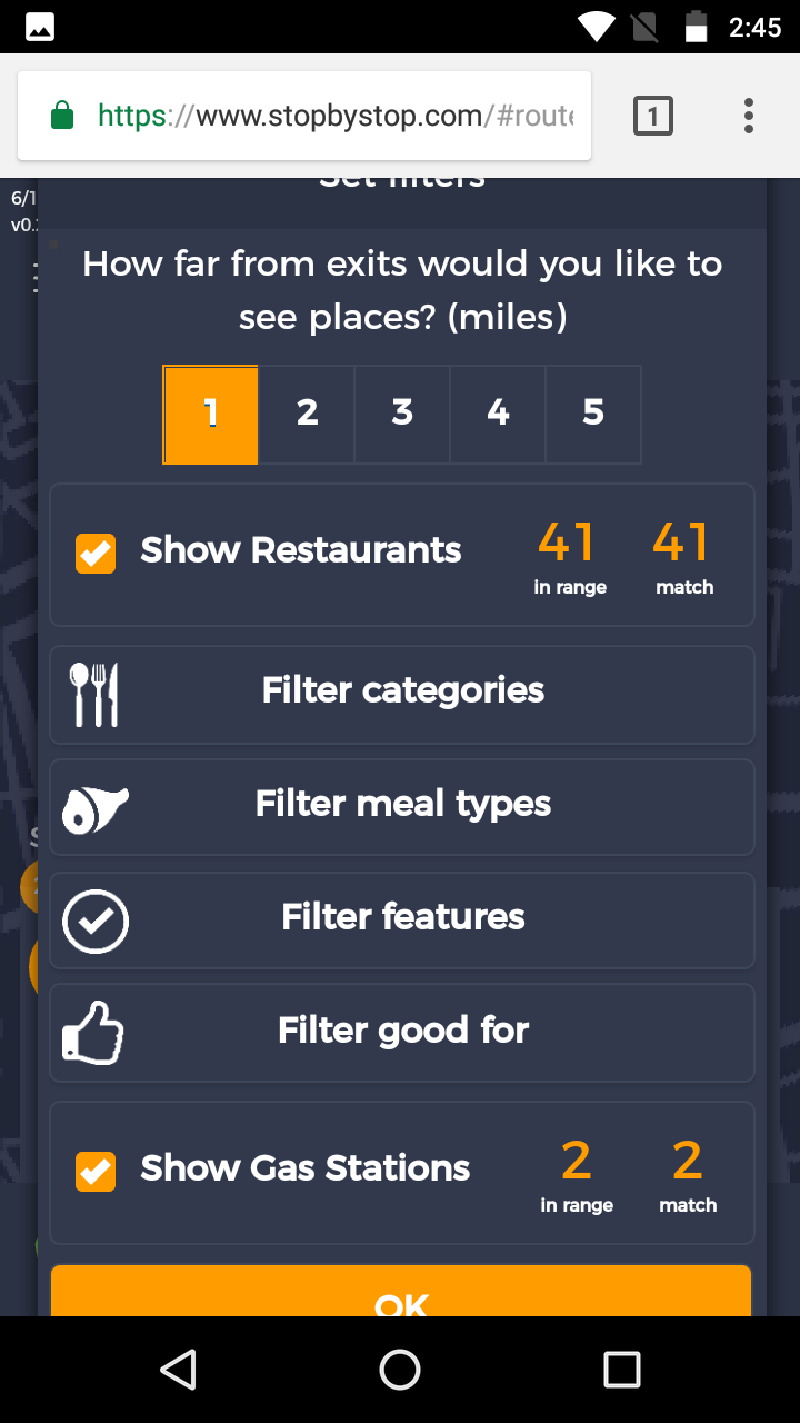 6. FiltersCategories. A. Navigate to test_server/route/47.68950,-122.03859-to-tacoma-wa-united-states. B. Click on Filters. C. Pick 5 miles from exit D. Unselect gas stations E. Leave restaurants selected. F. Click Filter categories select clear all, then select American(traditional) only. G. Click OK to close Filters. Take screenshot. |