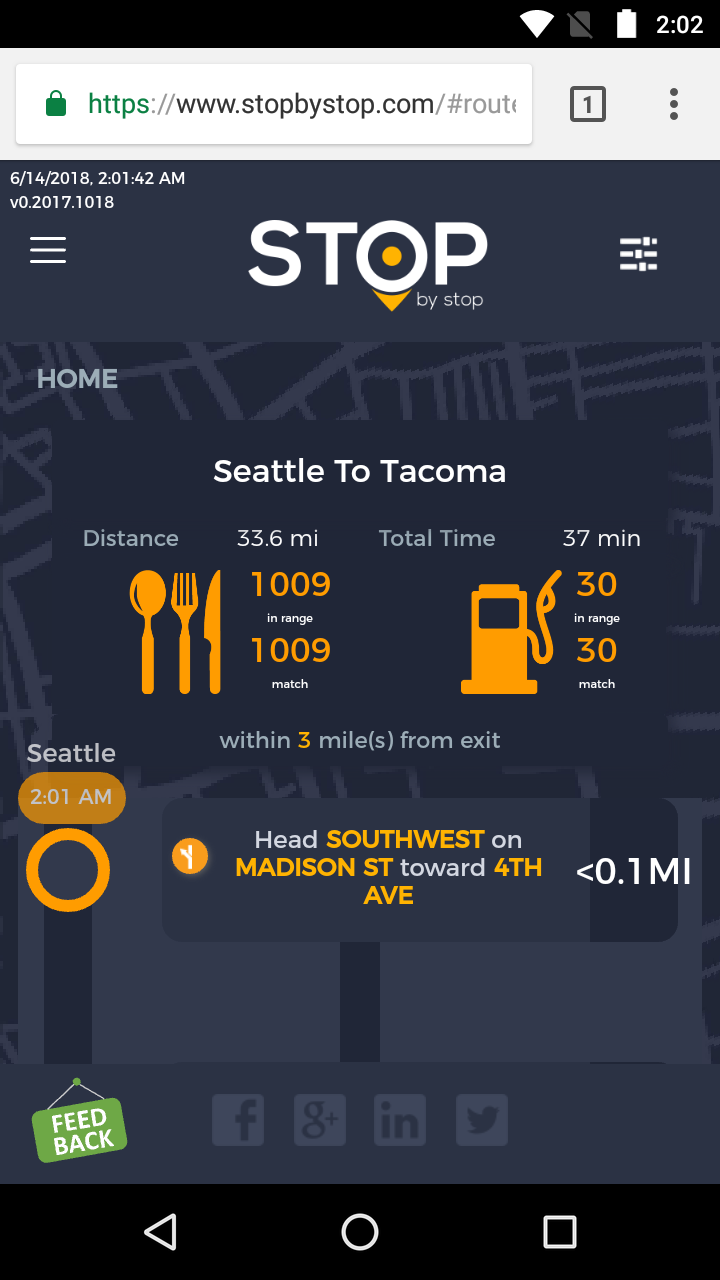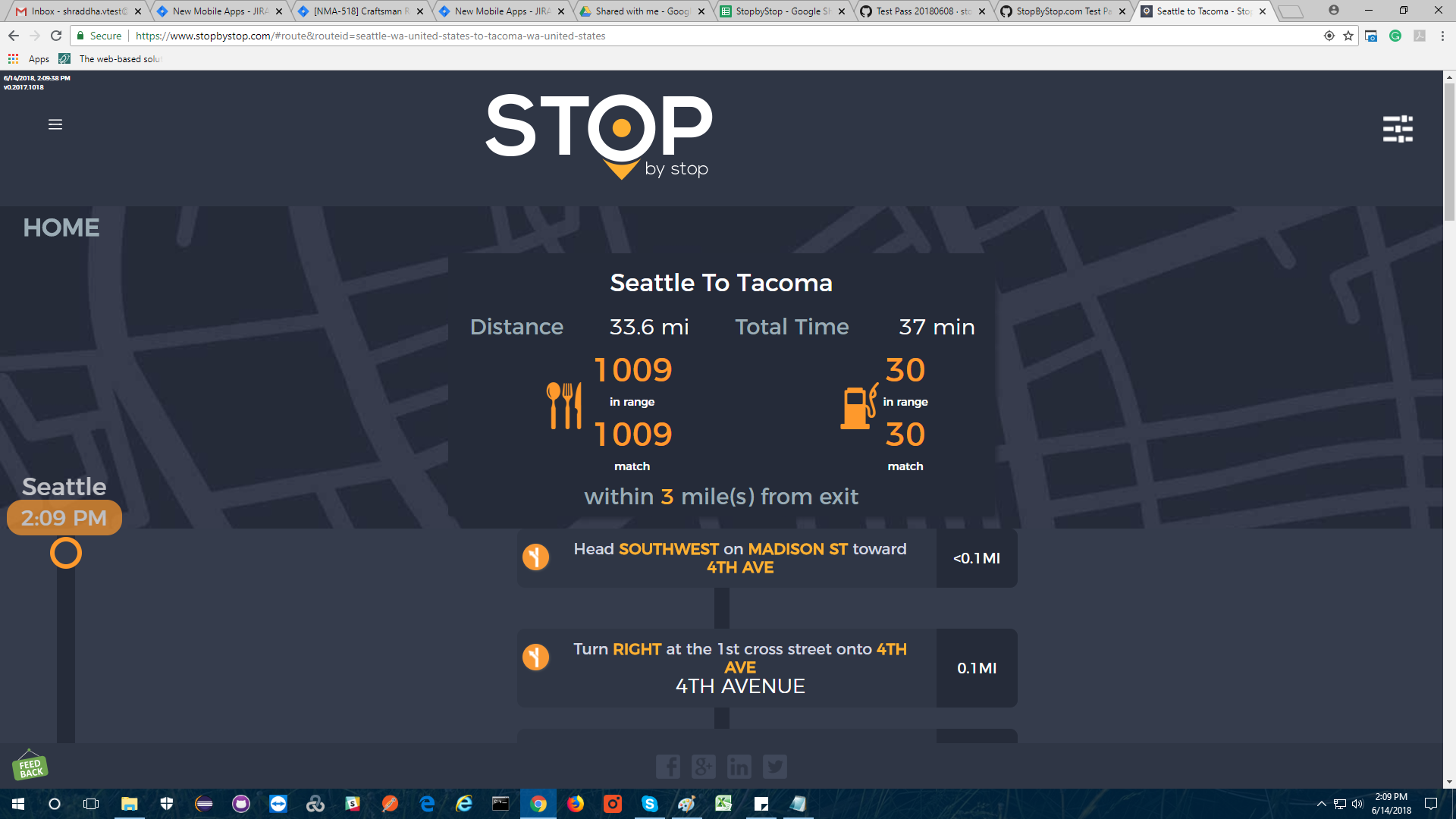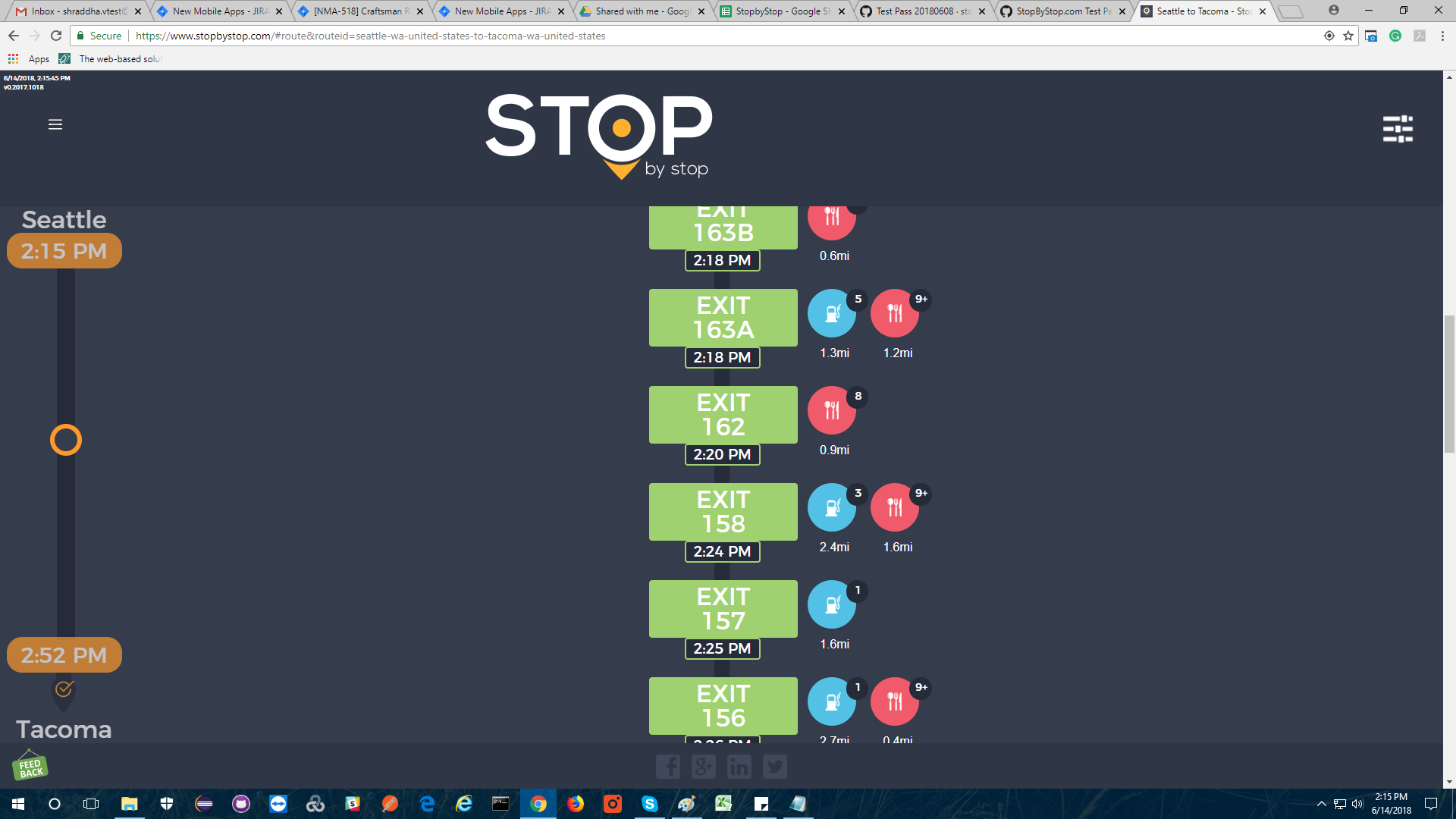 2. RoutePageRefesh. A. Navigate to test_server/ B. Type seat in the first textbox and pick Seattle from the dropdown. C. Type tac in the second textbox and pick Tacoma from the dropdown. D. Click View my trip. E. Route page should open showing exits with restaurants and gas station icons. F. Refresh the browser. Route page should open, NOT home page. Take screenshot. |