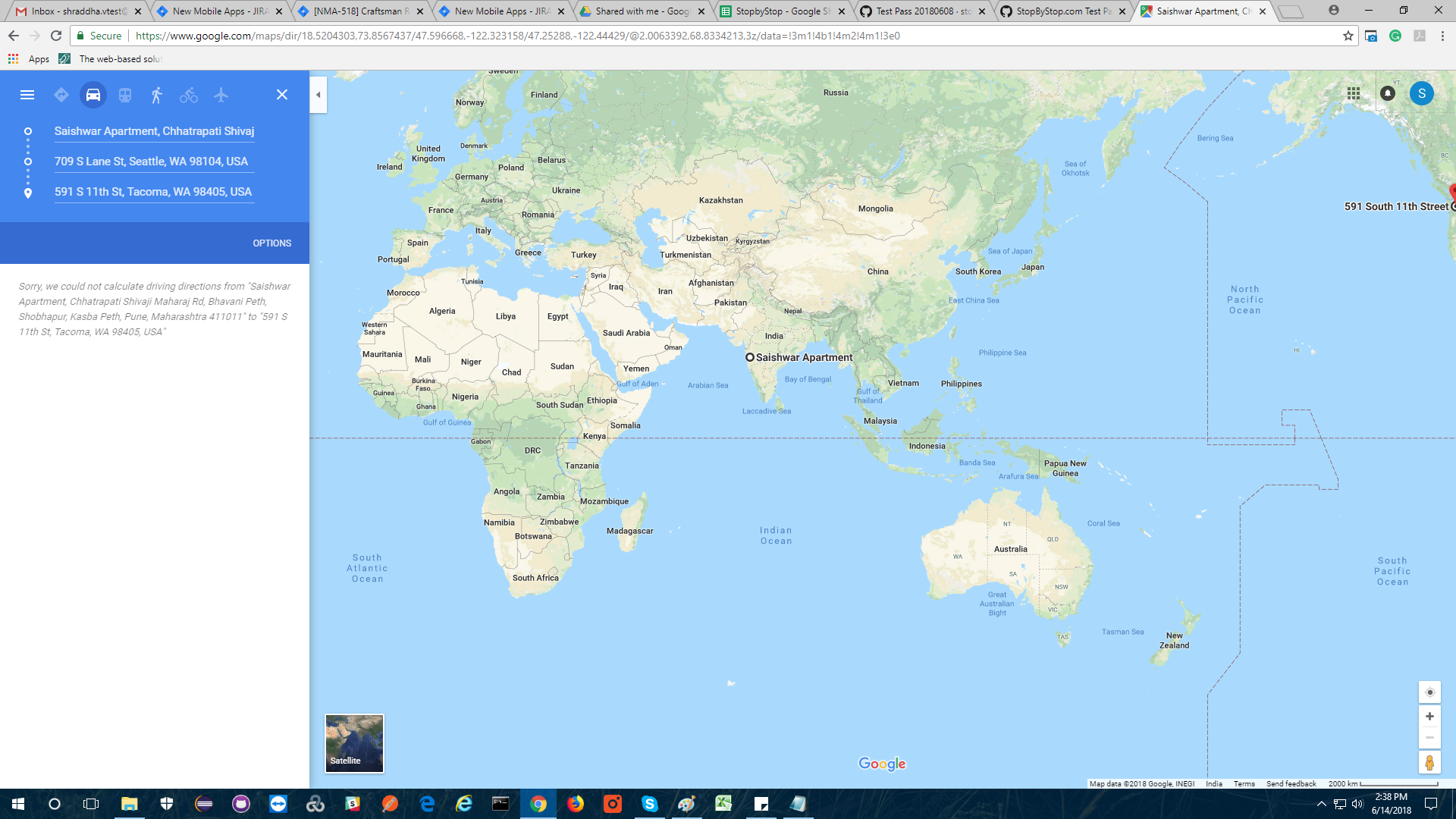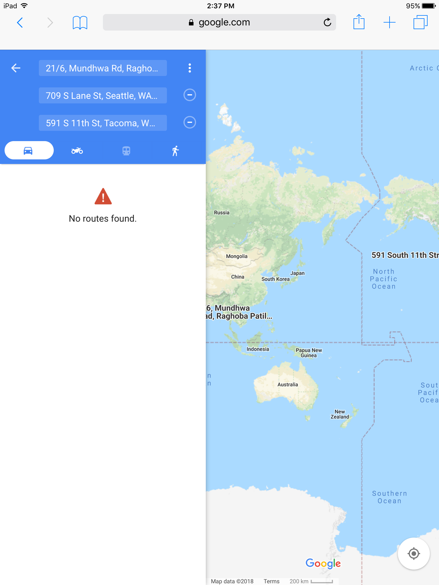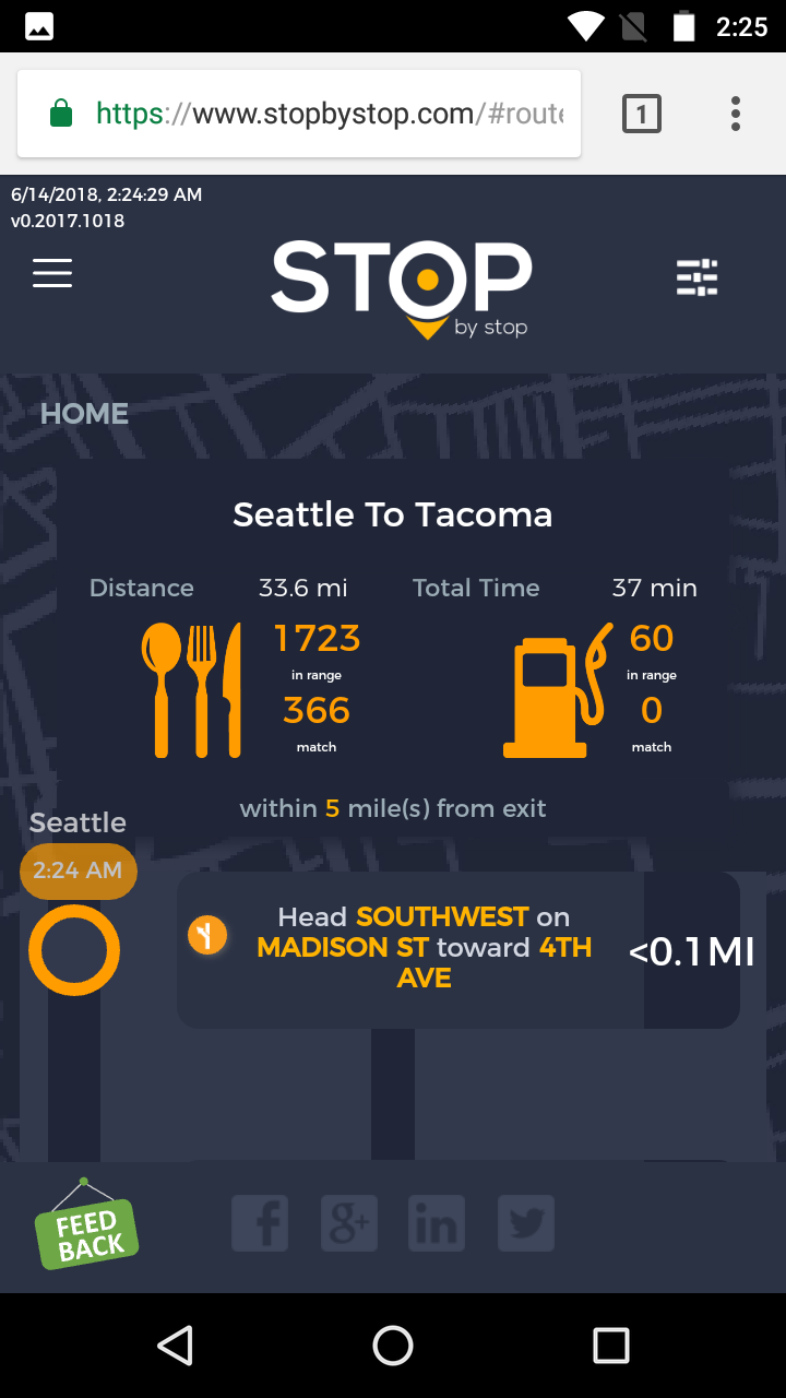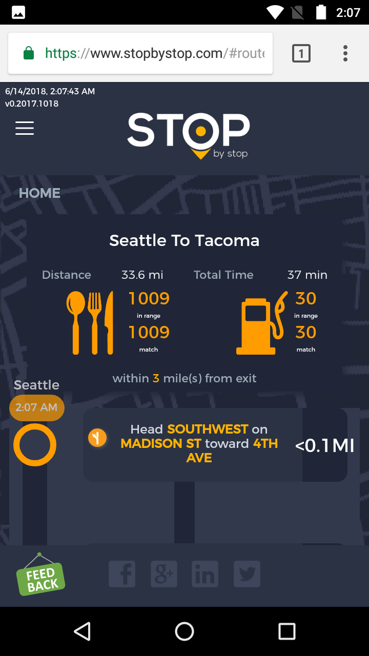 2. RoutePageRefesh. A. Navigate to test_server/ B. Type seat in the first textbox and pick Seattle from the dropdown. C. Type tac in the second textbox and pick Tacoma from the dropdown. D. Click View my trip. E. Route page should open showing exits with restaurants and gas station icons. F. Refresh the browser. Route page should open, NOT home page. Take screenshot. |